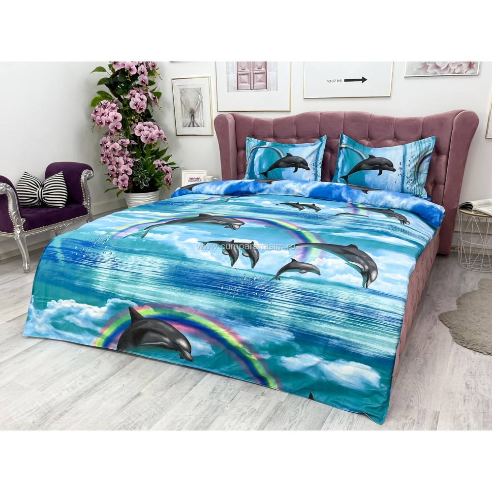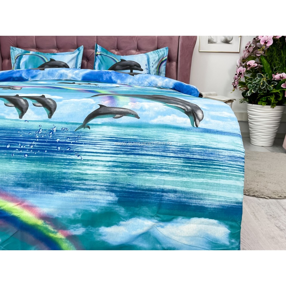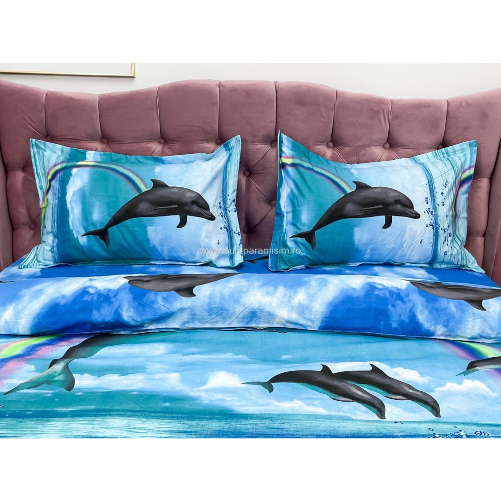 Lenjerie pat dublu, IMPRIMEU 3D DIGITAL, IDENTIC CU POZA, Albastru, delfini, Johny Home Pucioasa, cod produs: SPR-D-15