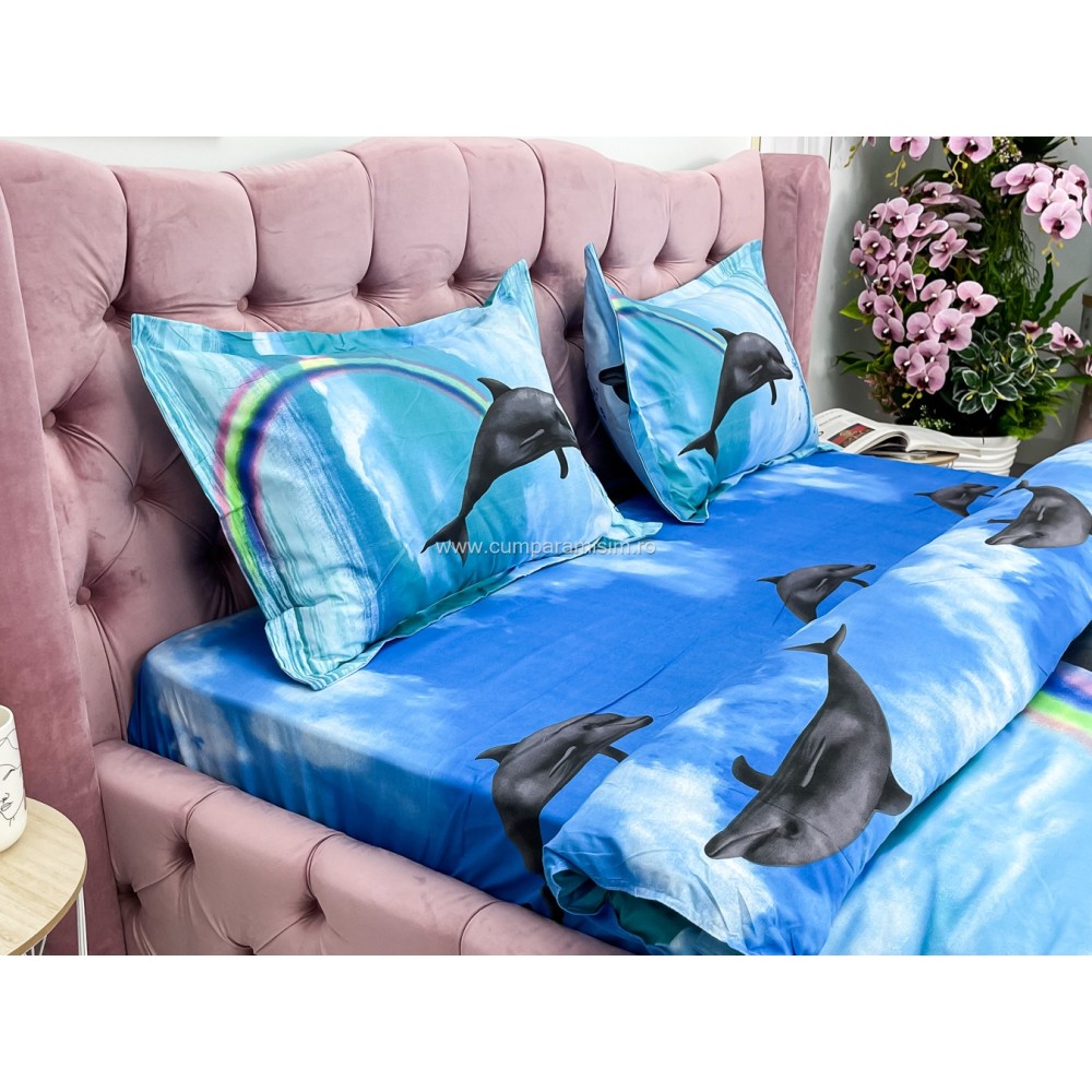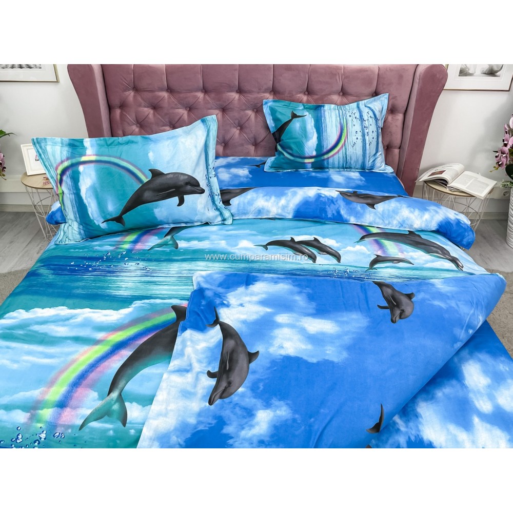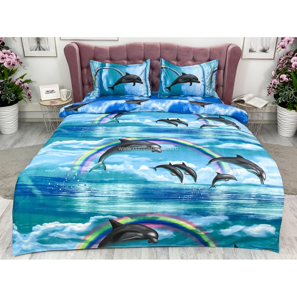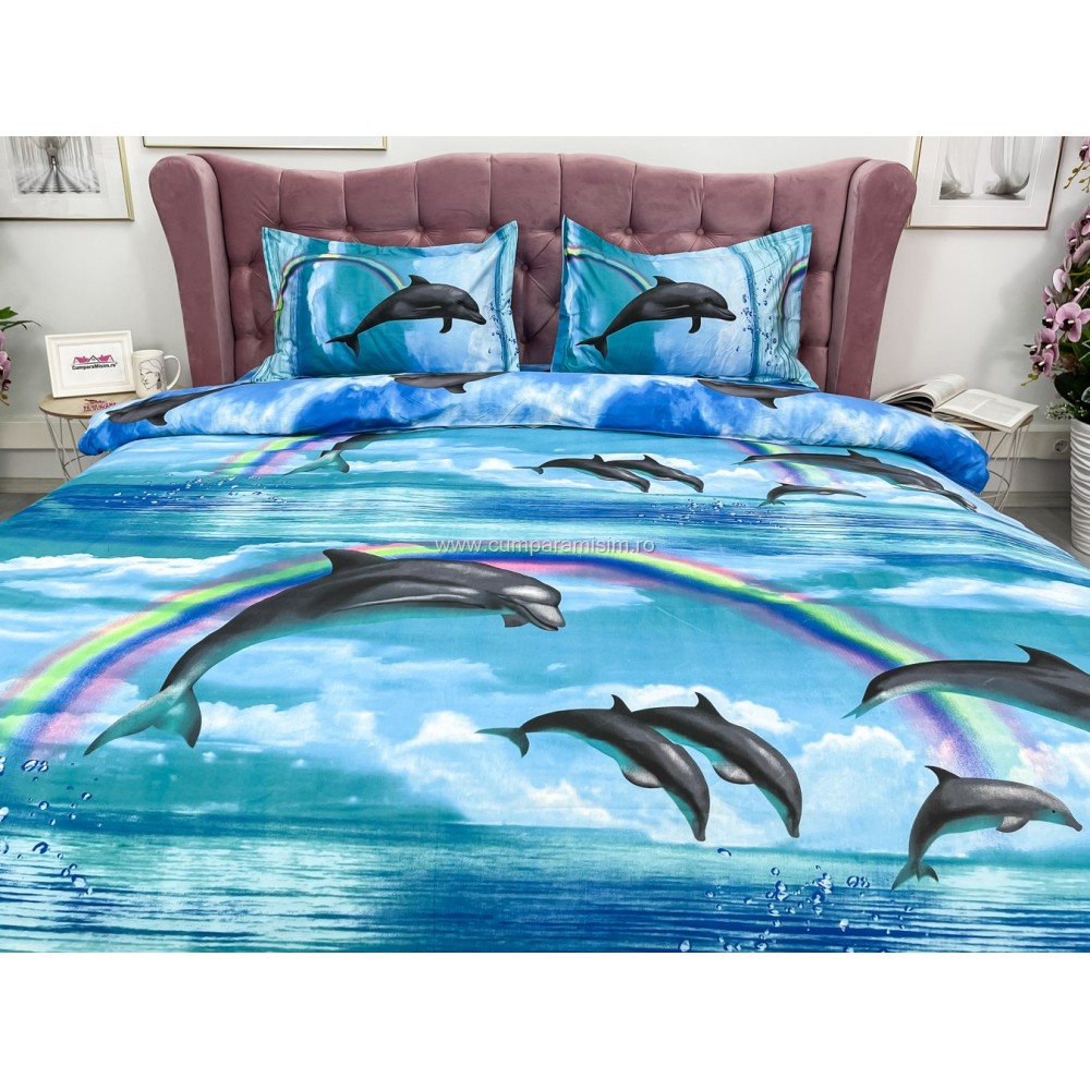 Lenjerie pat dublu, IMPRIMEU 3D DIGITAL, IDENTIC CU POZA, Albastru, delfini, Johny Home Pucioasa, cod produs: SPR-D-15