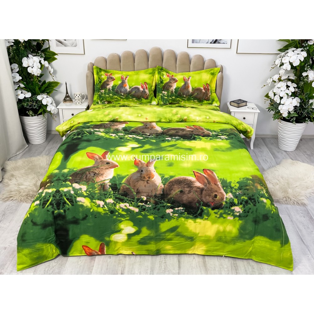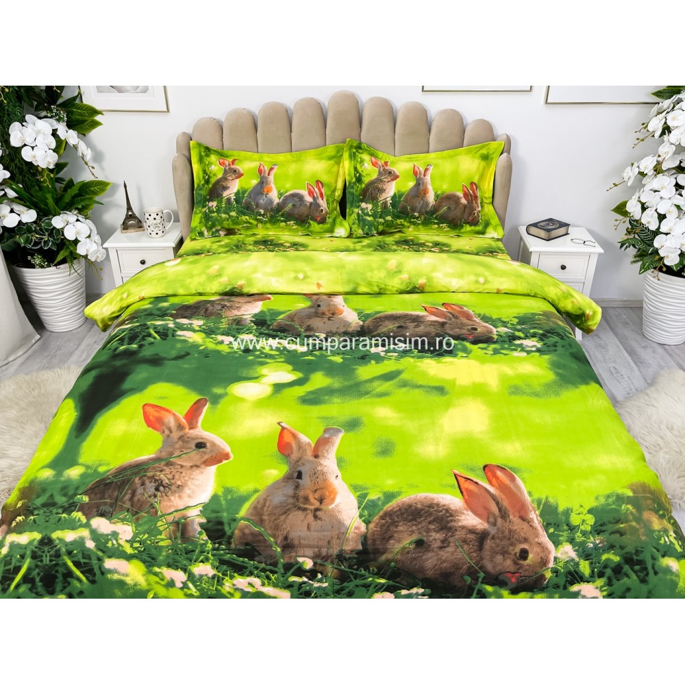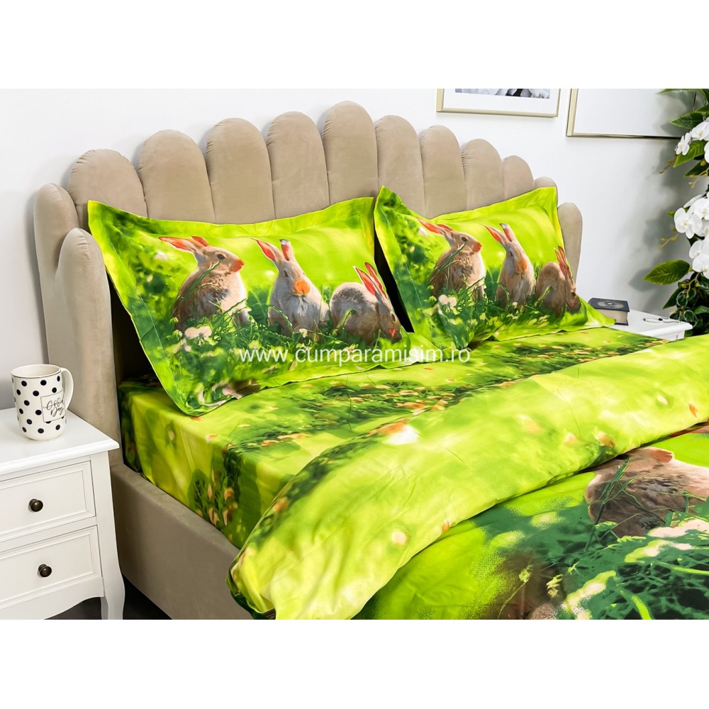 Lenjerie pat dublu, IMPRIMEU 3D DIGITAL, IDENTIC CU POZA, Verde, iepurasi, Johny Home Pucioasa, cod produs: SPR-D-04