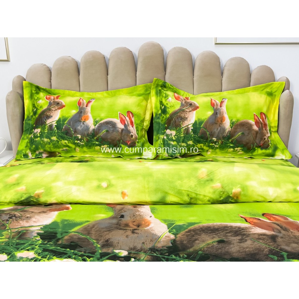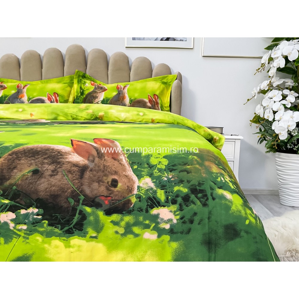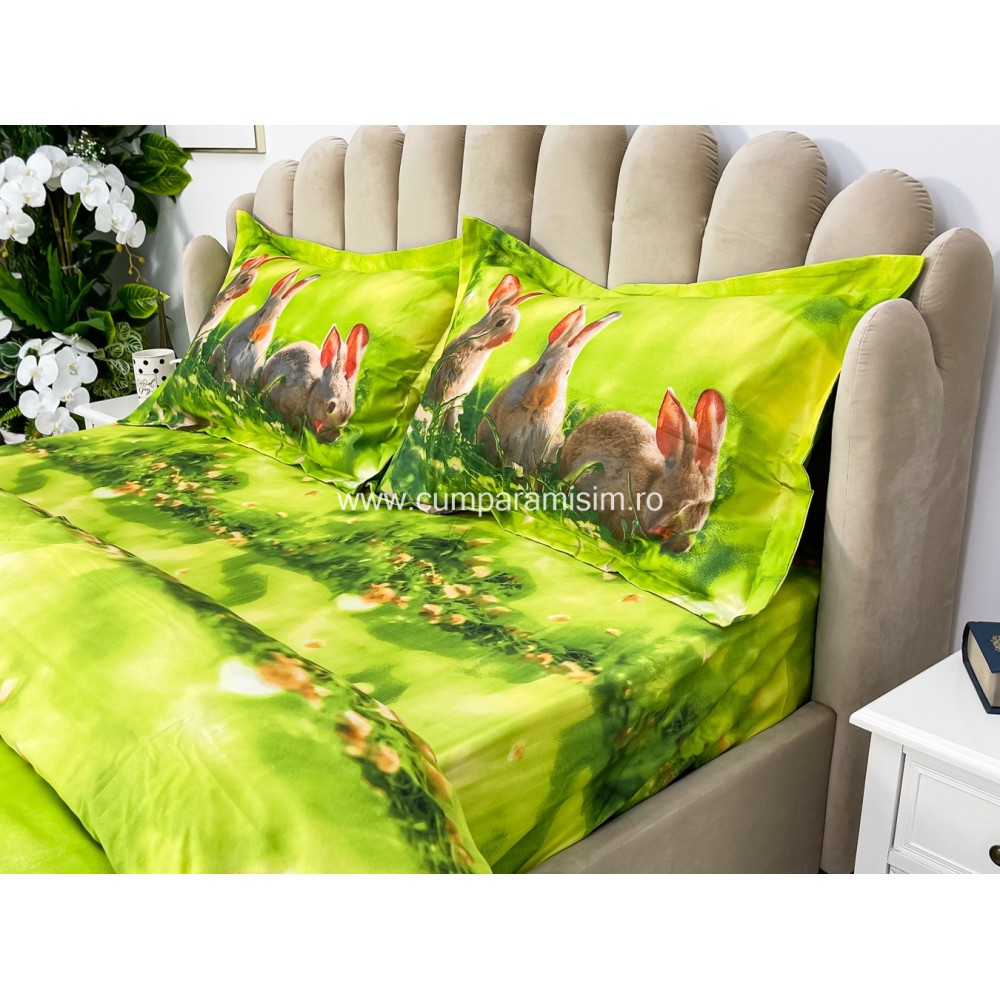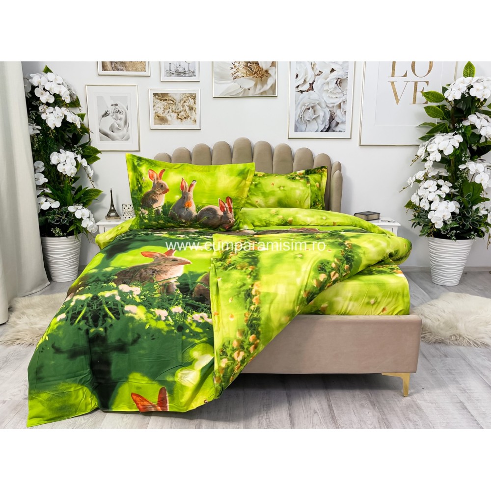 Lenjerie pat dublu, IMPRIMEU 3D DIGITAL, IDENTIC CU POZA, Verde, iepurasi, Johny Home Pucioasa, cod produs: SPR-D-04