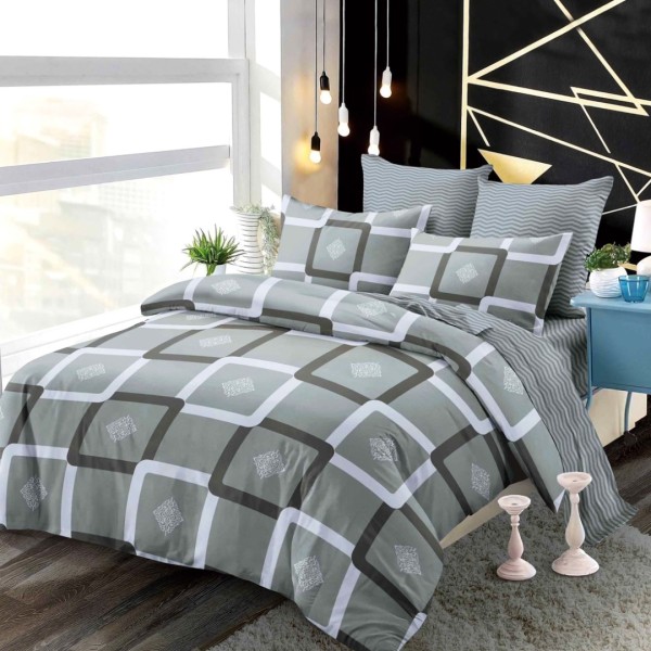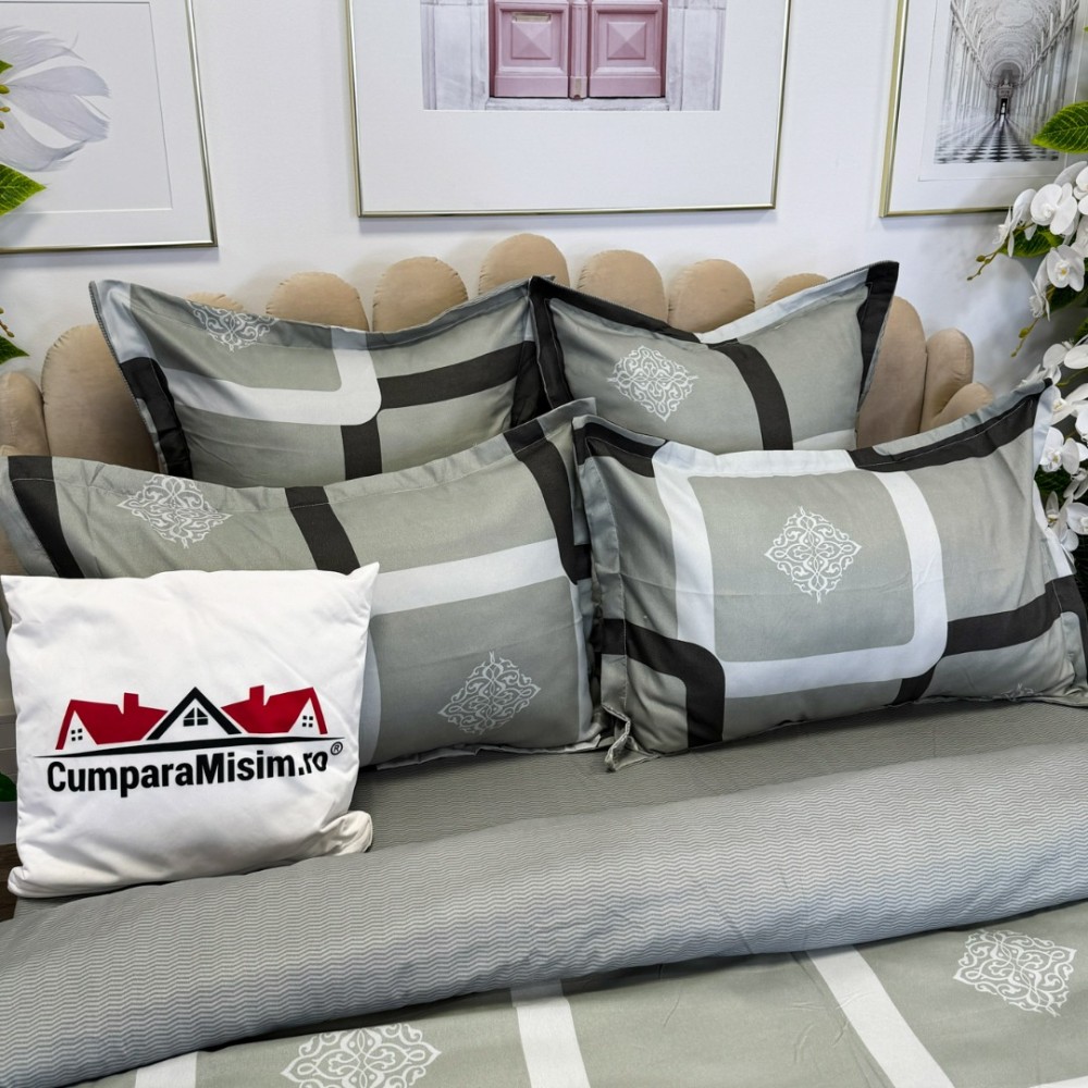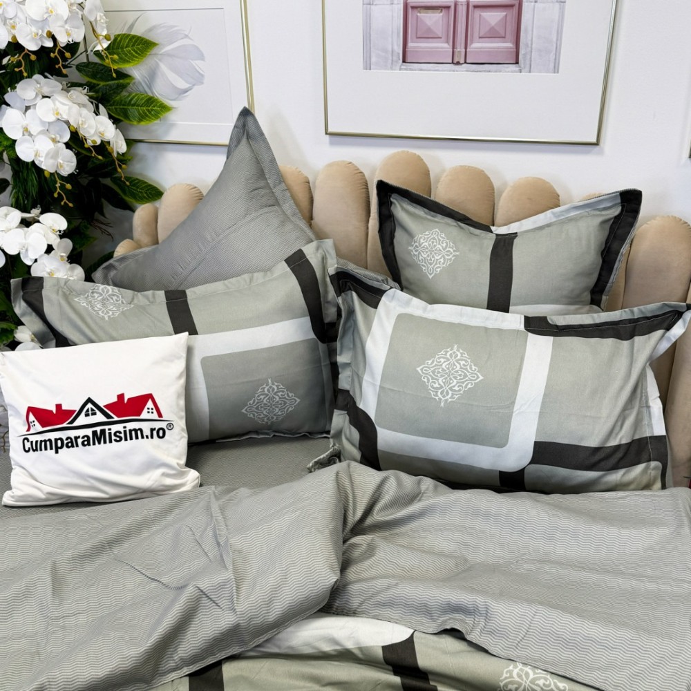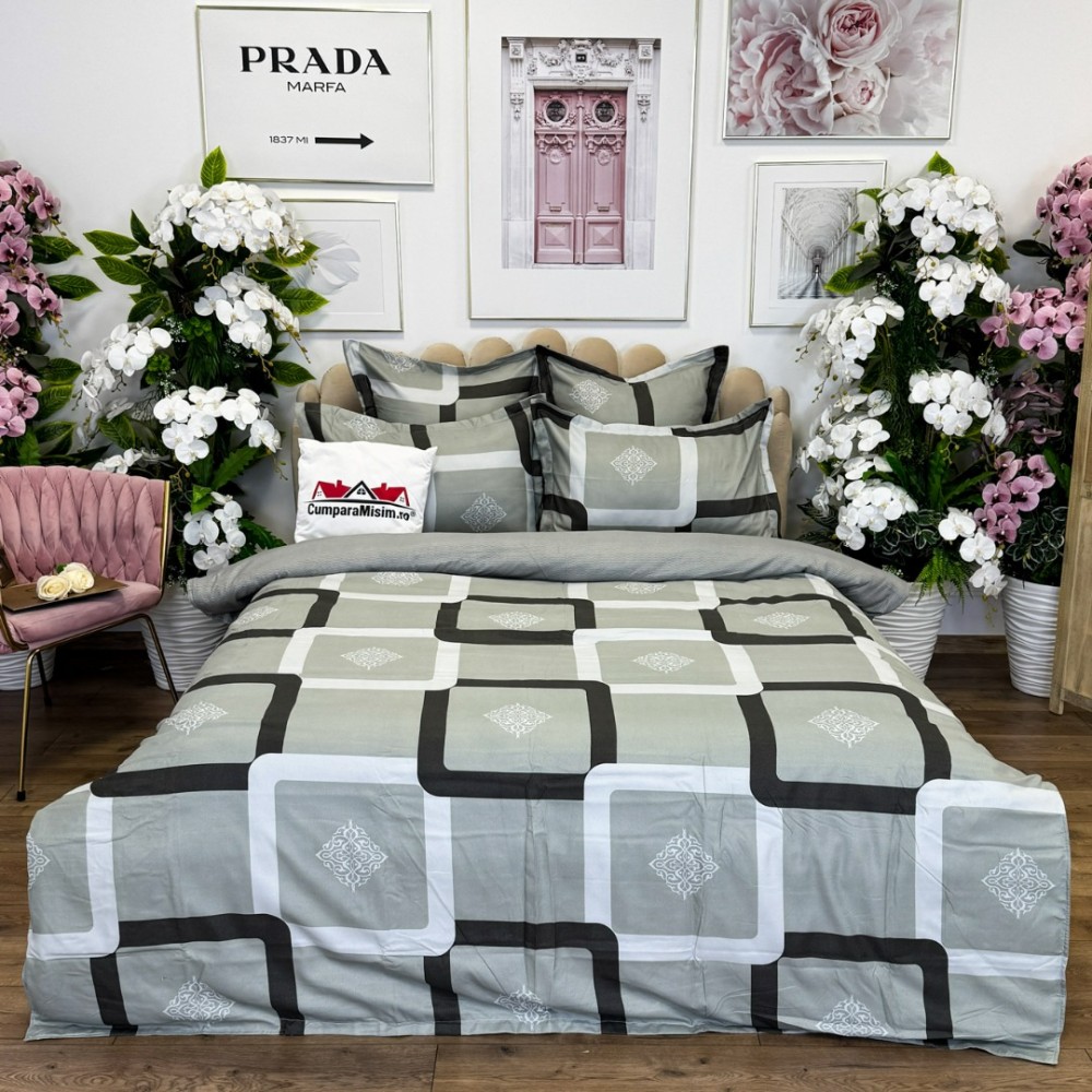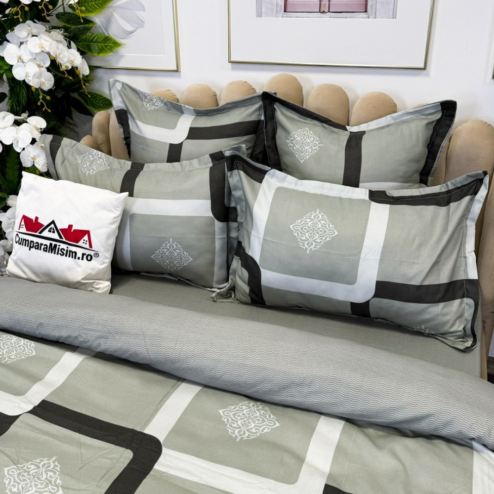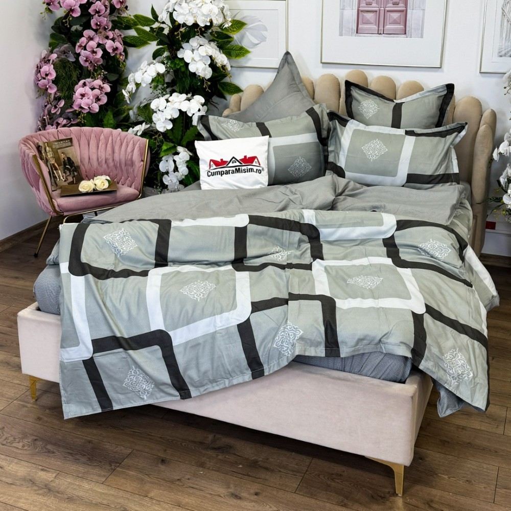 Lenjerie pat dublu, FINET, cu elastic, 6 piese, Gri, Forme Geometrice, Primavara Casa, cod produs: PRM-FE-B6009