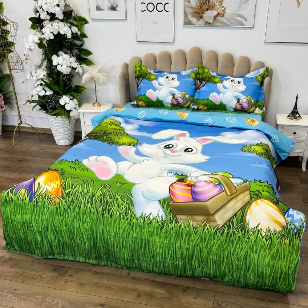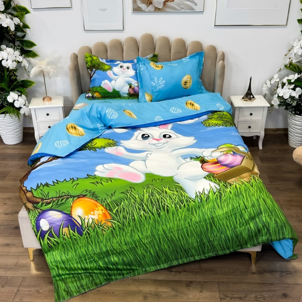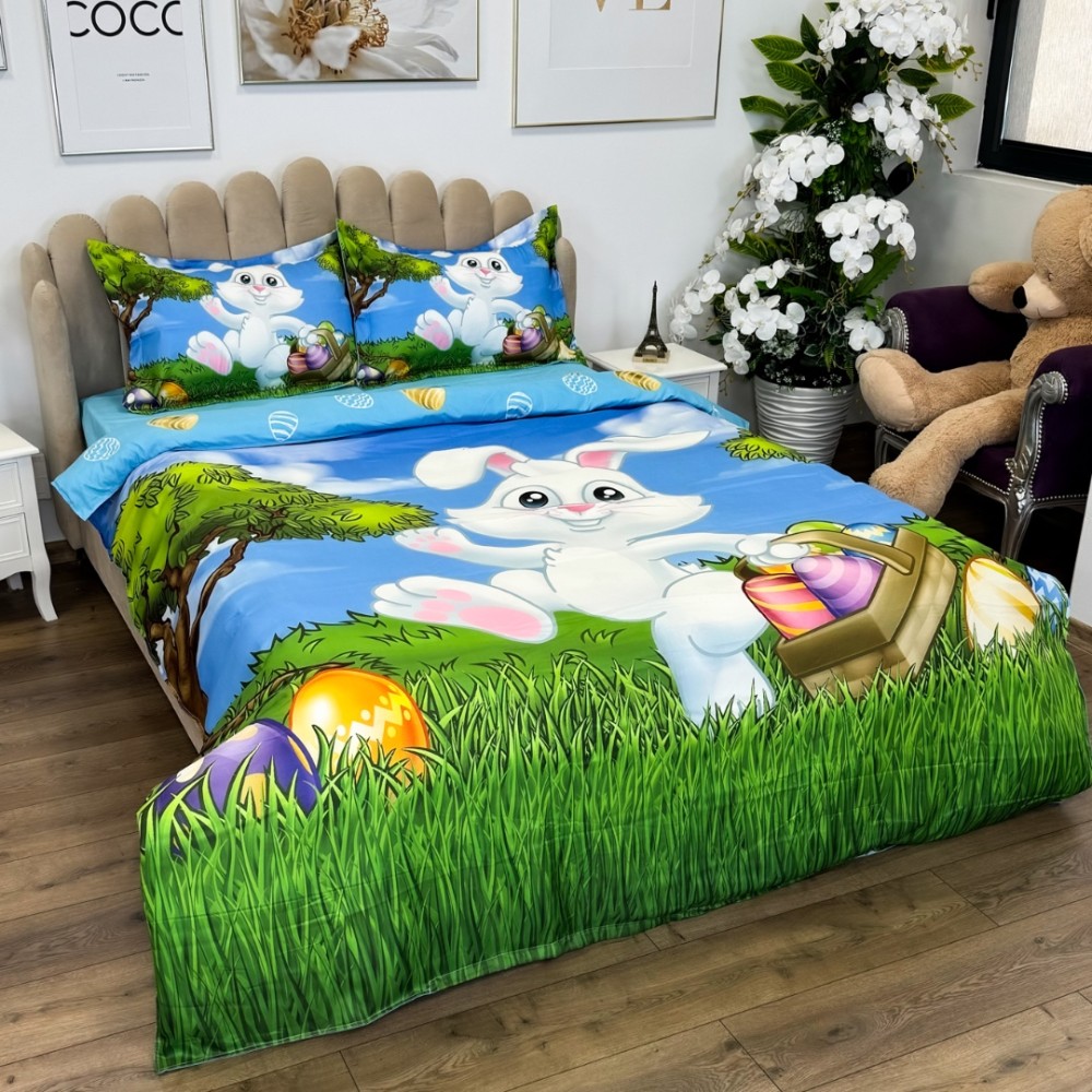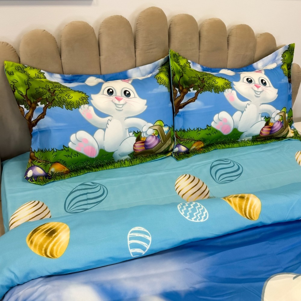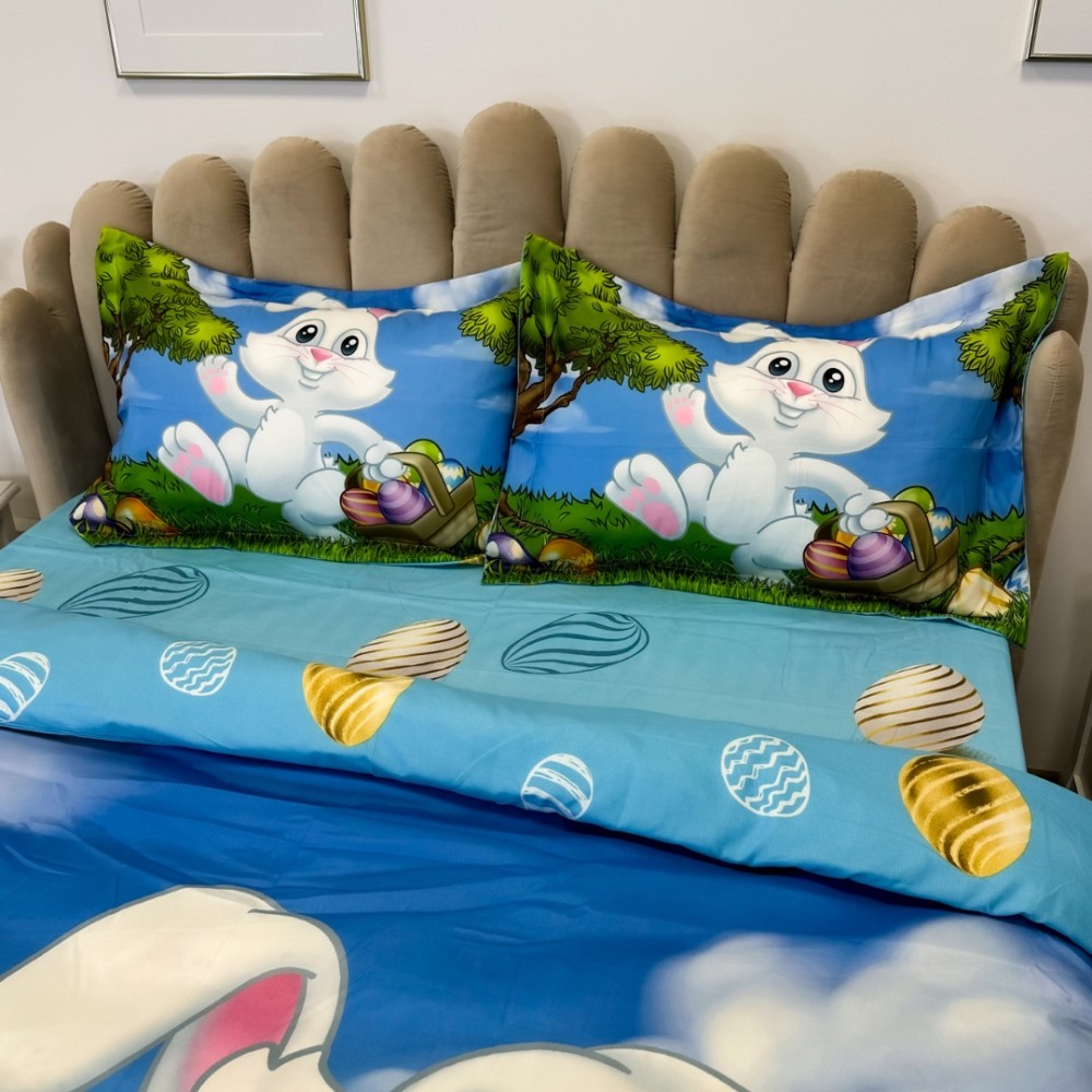Lenjerie de Pat Dublu, Finet, Imprimeu Digital cu Iepuras si Oua, IDENTIC CU POZA, 4 Piese, Bleu, Super Design Pucioasa, cod produs: SDP-PF-23