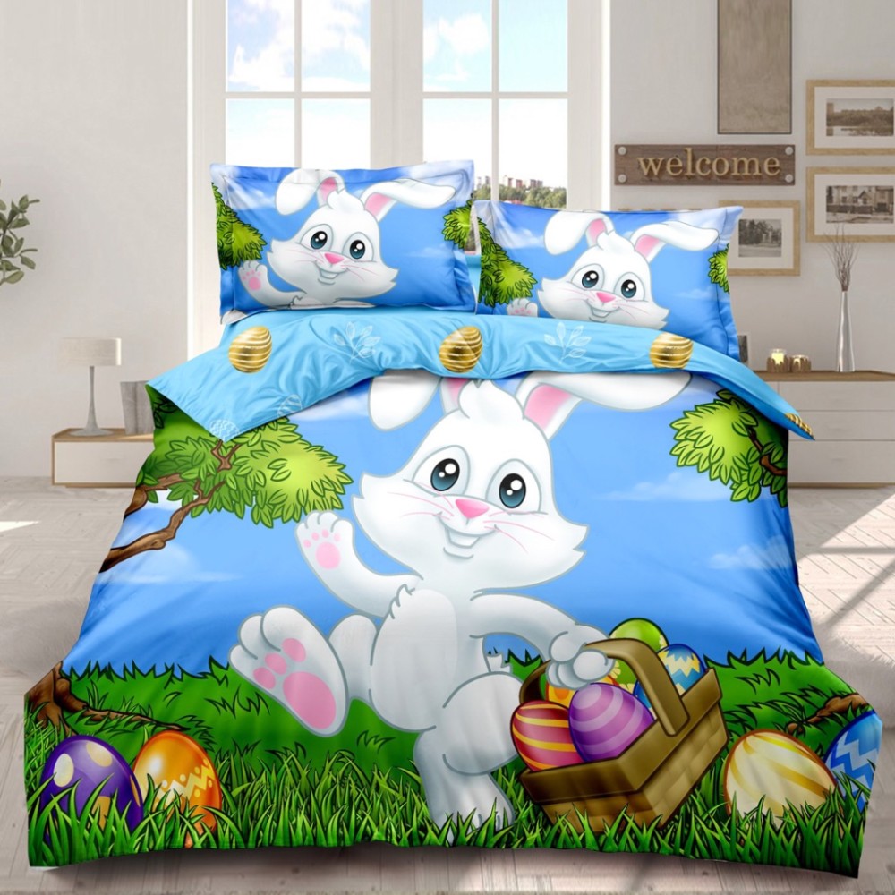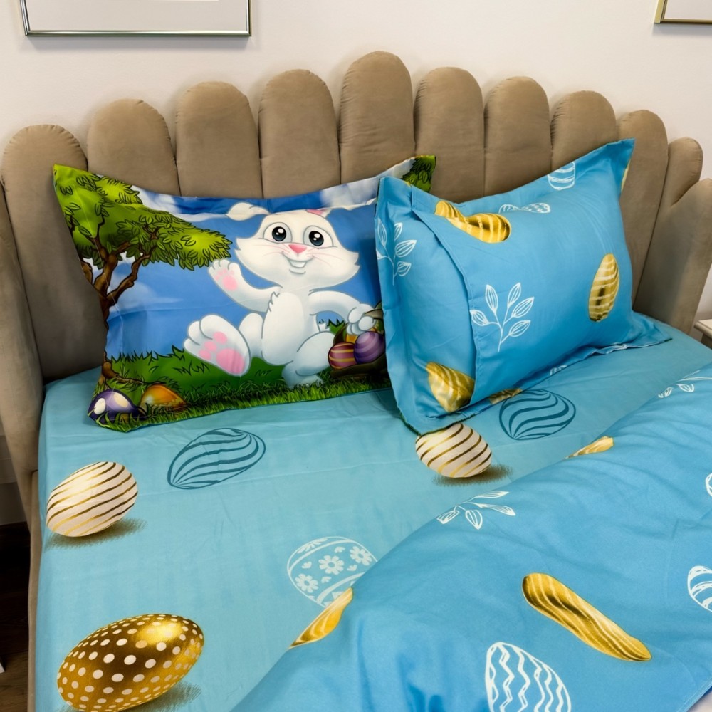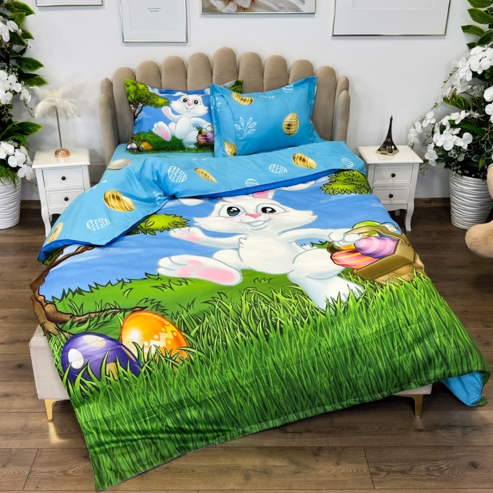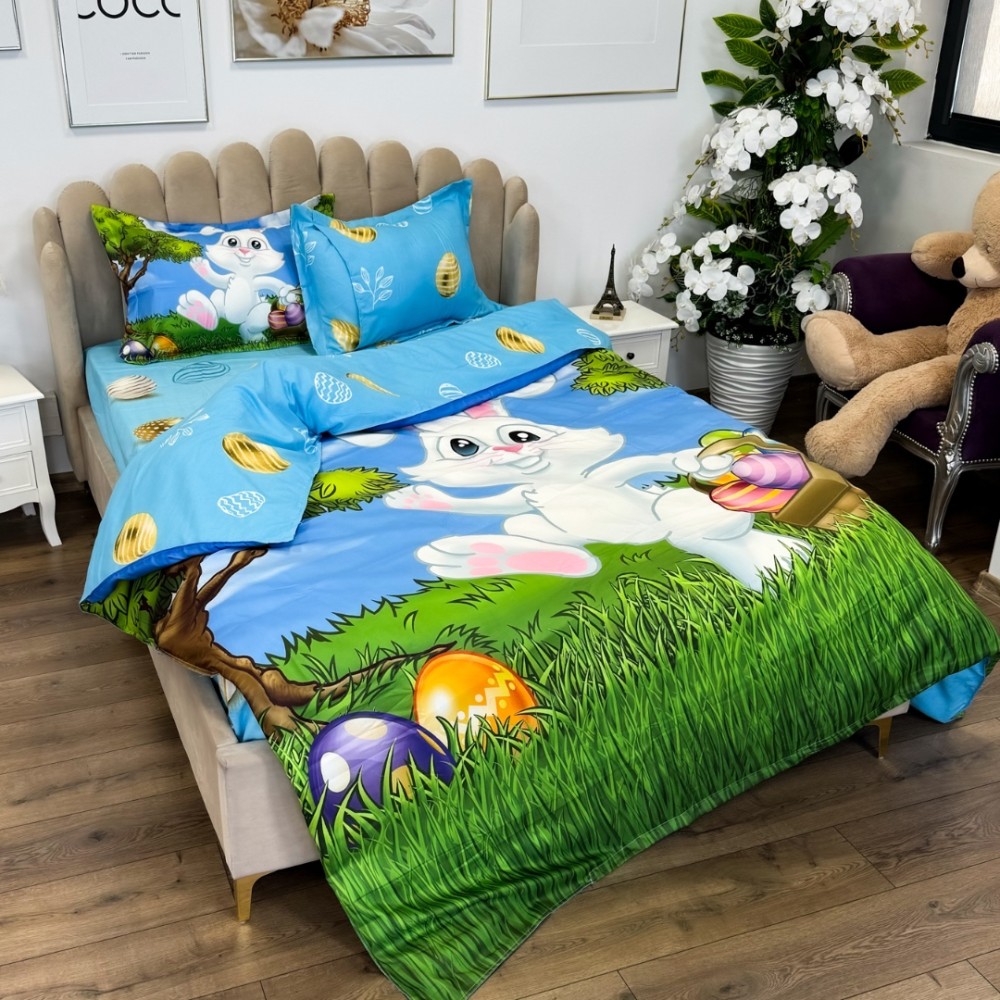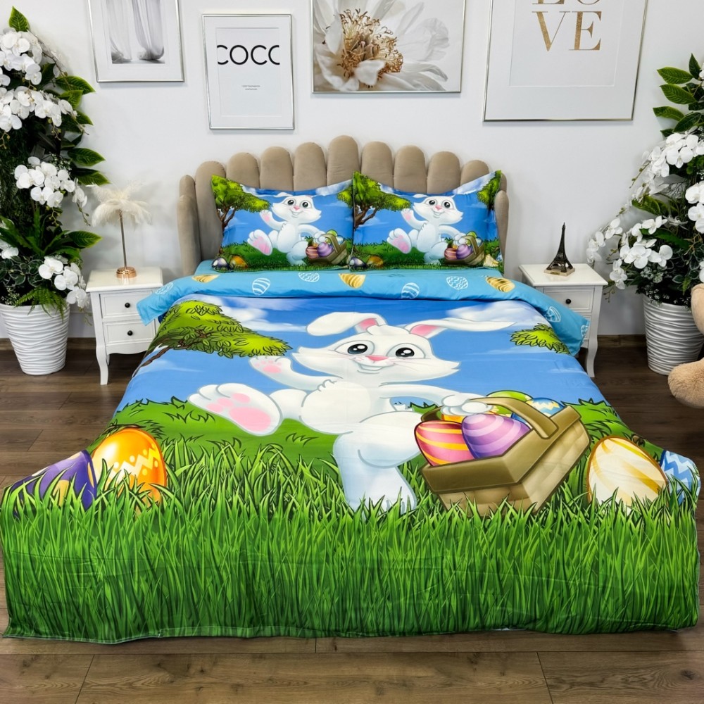 Lenjerie de Pat Dublu, Finet, Imprimeu Digital cu Iepuras si Oua, IDENTIC CU POZA, 4 Piese, Bleu, Super Design Pucioasa, cod produs: SDP-PF-23