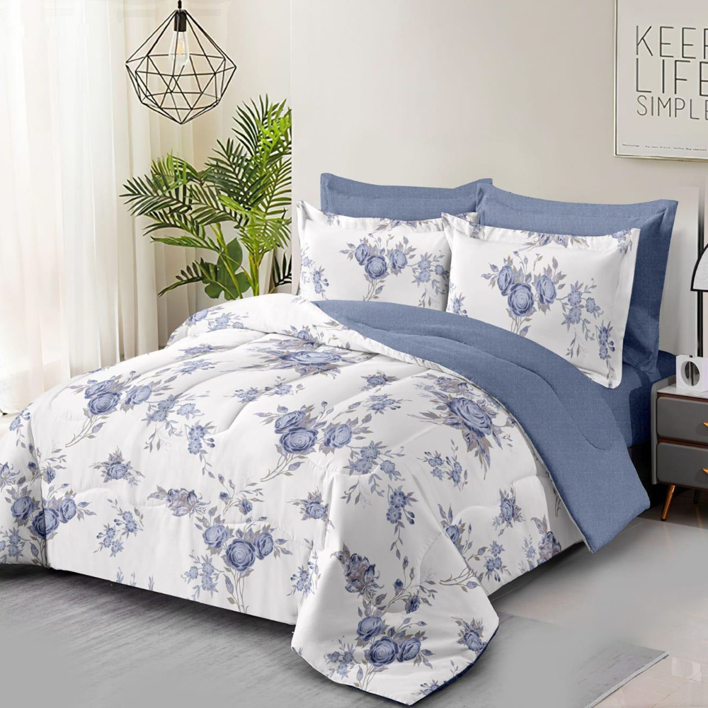 Lenjerie Pat Dublu, FINET, 6 piese, Alb, Bleu, flori, East Romania, cod produs: EST-FN-284