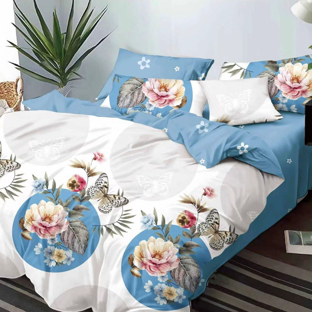 Lenjerie Pat Dublu, FINET, 6 piese, Alb, Bleu, flori, East Romania, cod produs: EST-FN-301