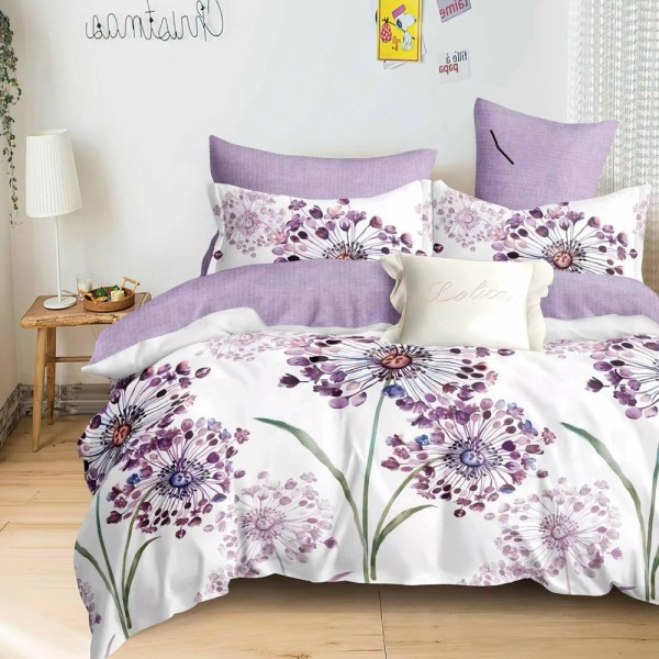 Lenjerie Pat Dublu, FINET, 6 piese, Alb, Mov, flori, East Romania, cod produs: EST-FN-336