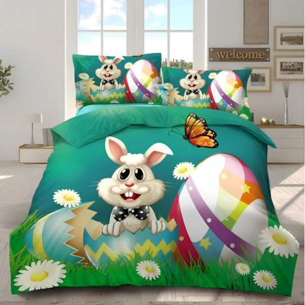 Lenjerie de Pat Dublu, Finet, Imprimeu Digital cu Iepuras si Oua, IDENTIC CU POZA, 4 Piese, Verde , Super Design Pucioasa, cod produs: HRT-LP-02