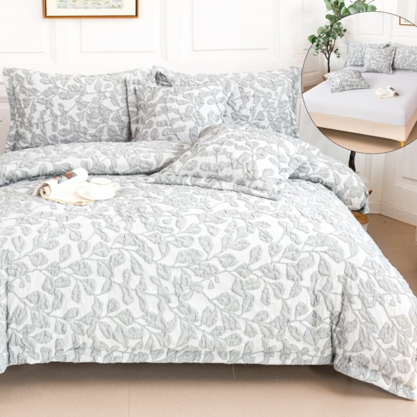 Lenjerie Pat Dublu, Cearșaf cu Elastic, 5 Piese, Bumbac 4 Anotimpuri Fin, Broderie Latoasă - Confort și Eleganță, Gri, Frunze, Casa Minunata, cod produs: INS-BL12
