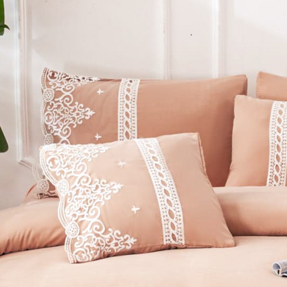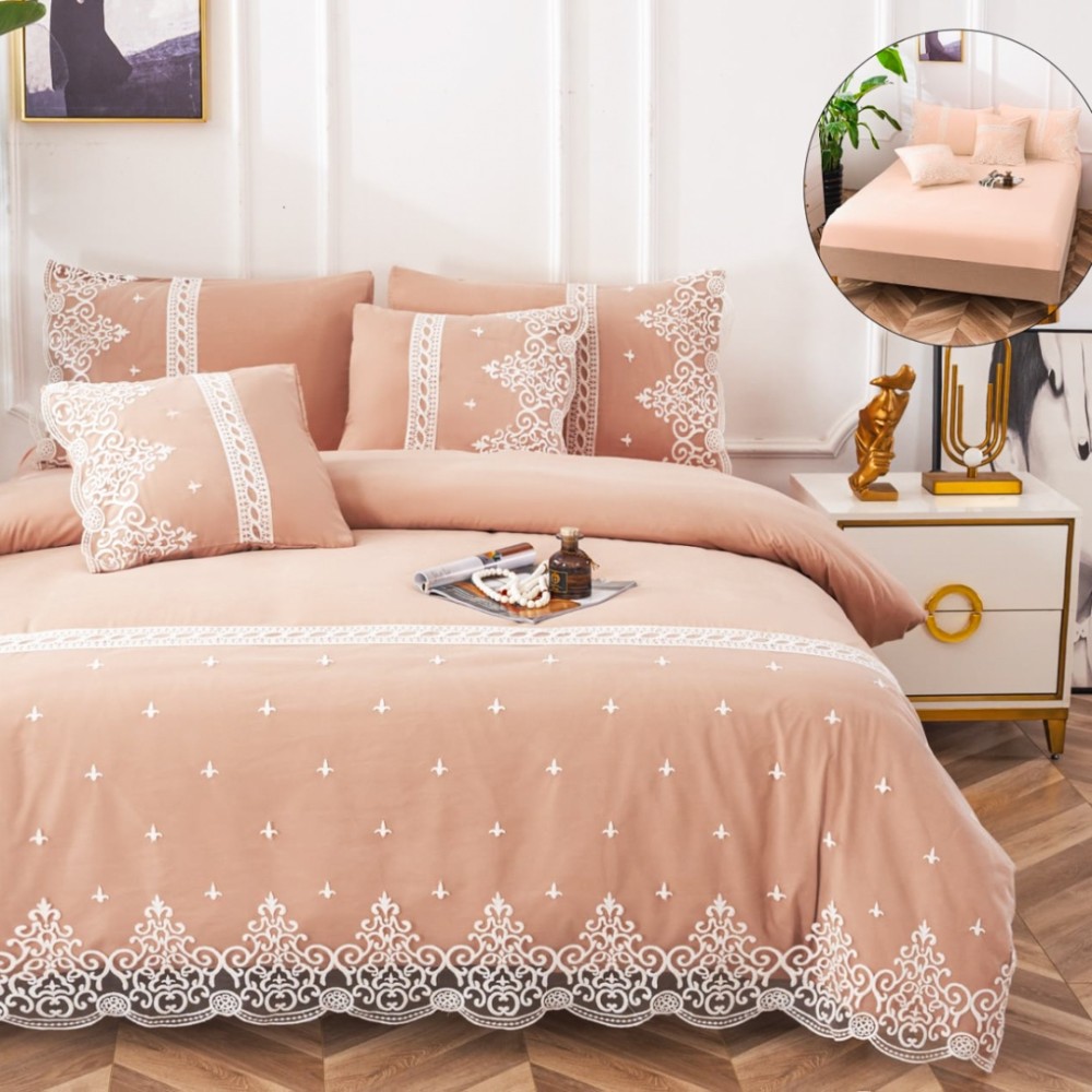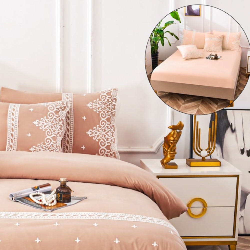 Lenjerie pat dublu, Fin cu Dantela si Broderie Rafinata, CEARSAF CU ELASTIC, 6 piese, Piersica, Casa Minunata, cod produs: INS-BFD03