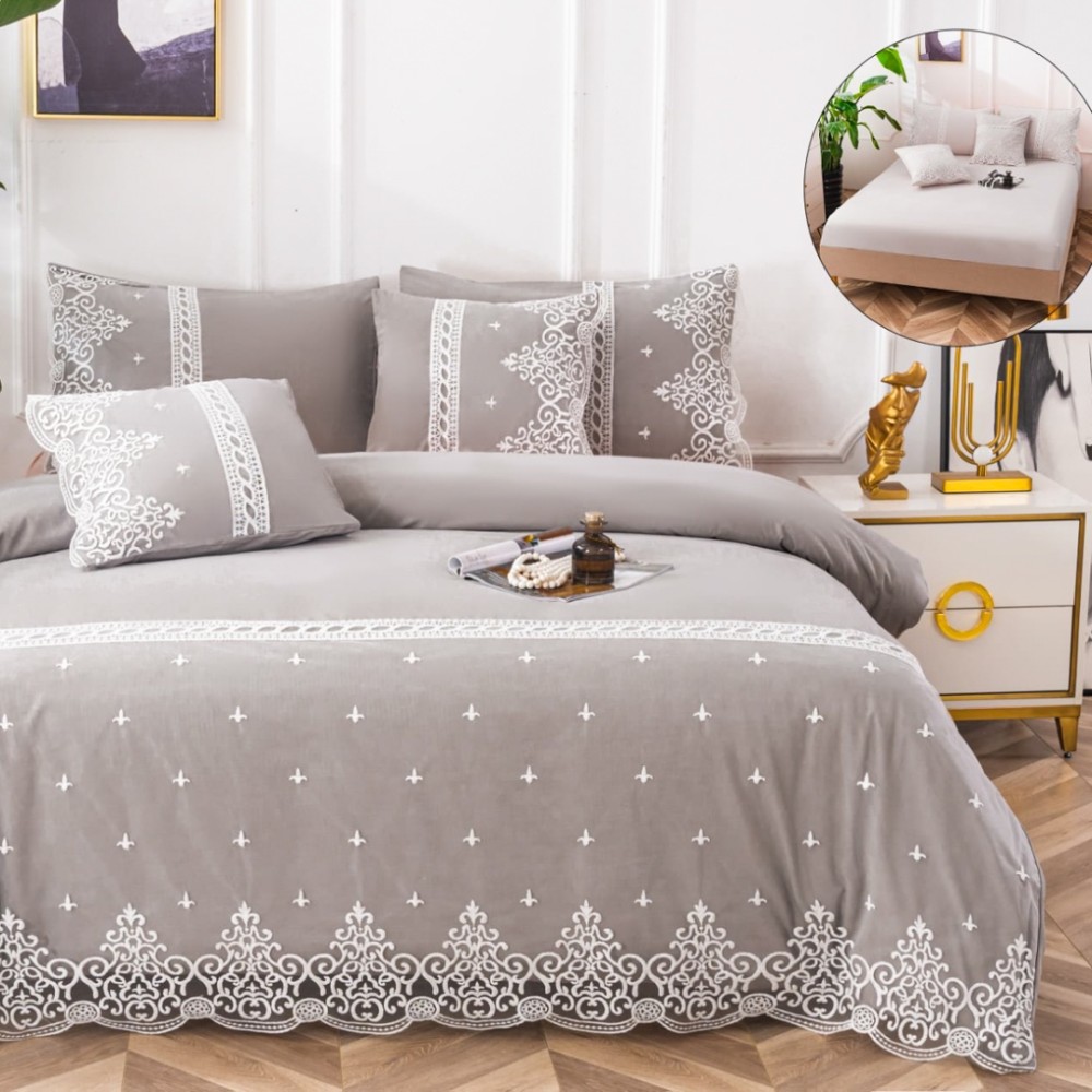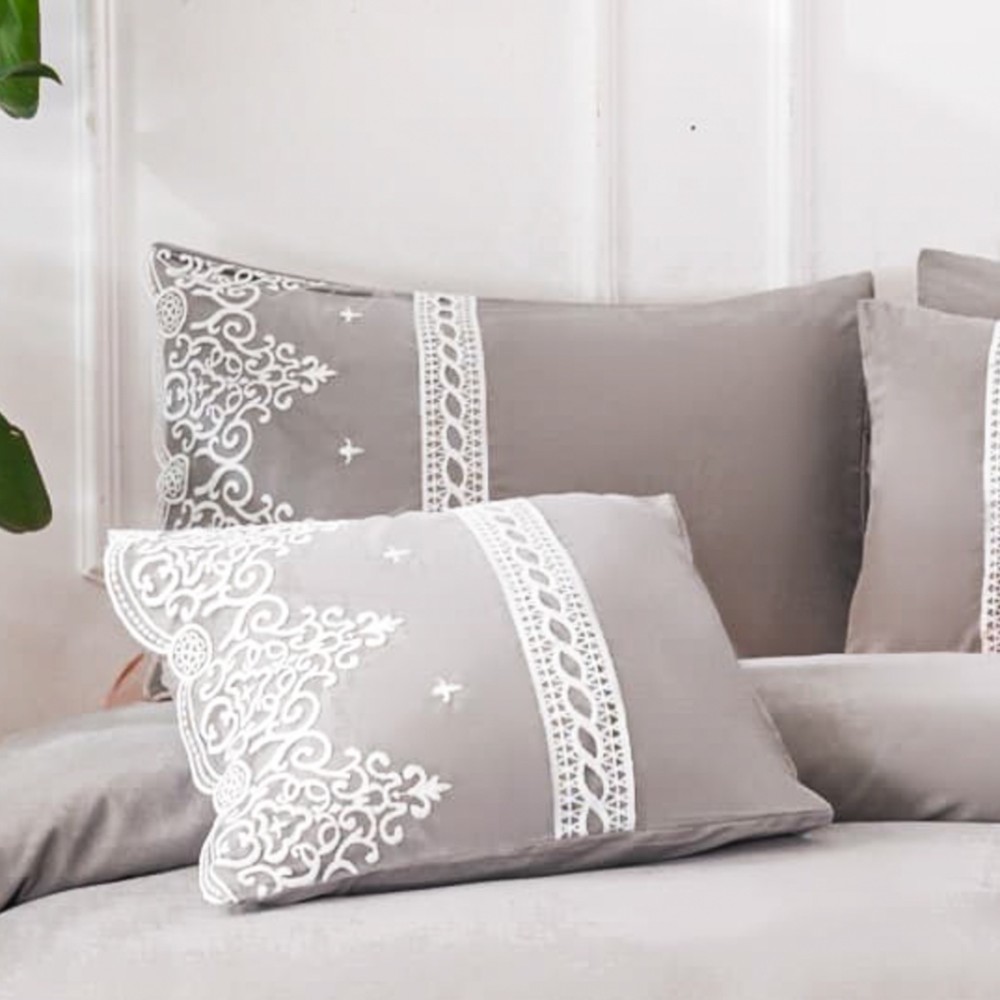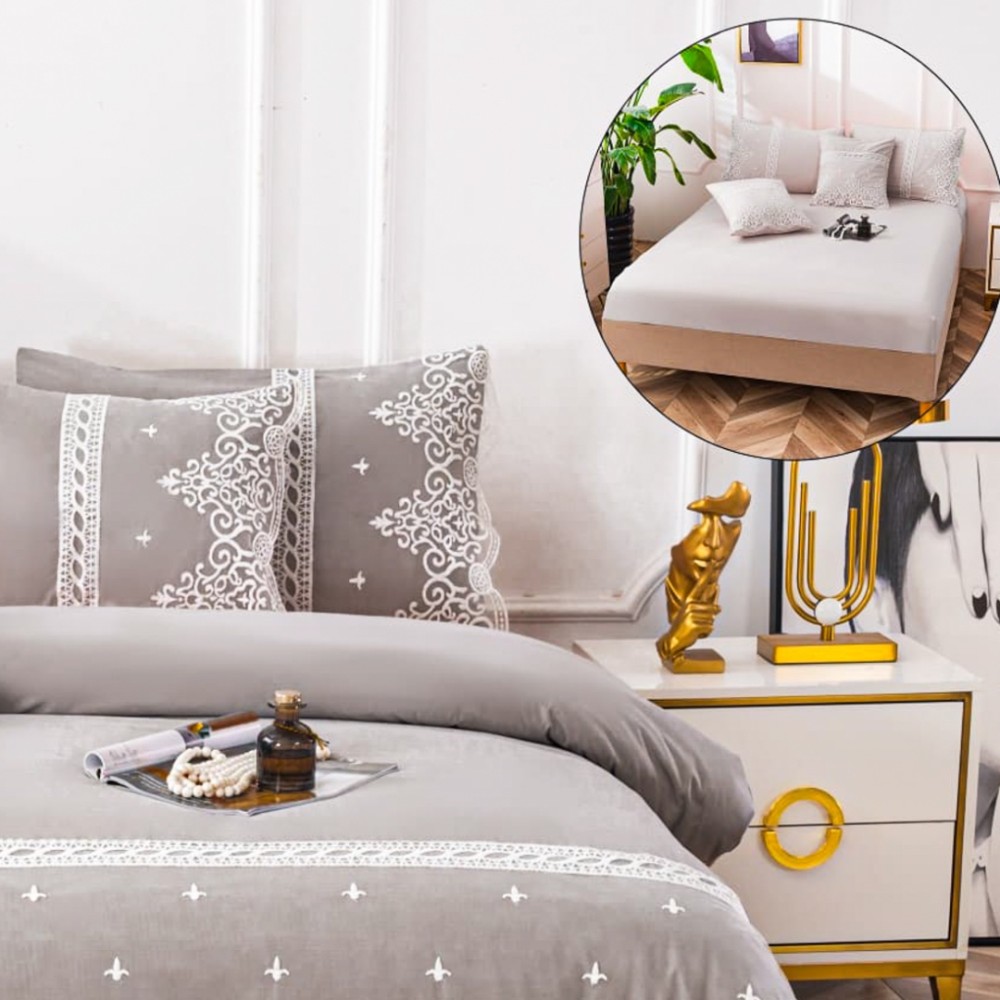 Lenjerie pat dublu, Fin cu Dantela si Broderie Rafinata, CEARSAF CU ELASTIC, 6 piese, Gri, Casa Minunata, cod produs: INS-BFD06