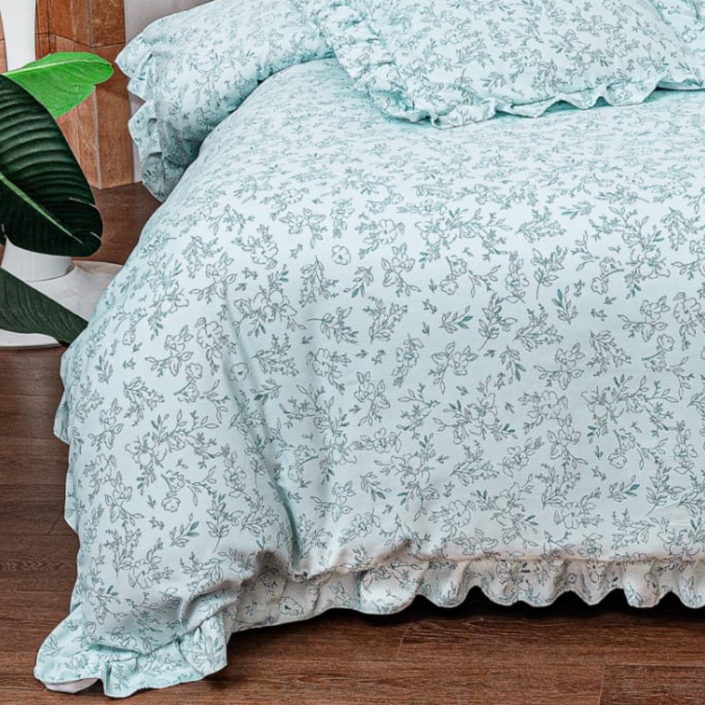 Lenjerie pat dublu, Finet cu Volanase, CEARSAF CU ELASTIC, 6 piese, Bleu, Flori, Casa Minunata, cod produs: INS-BFV08