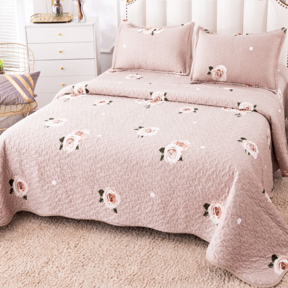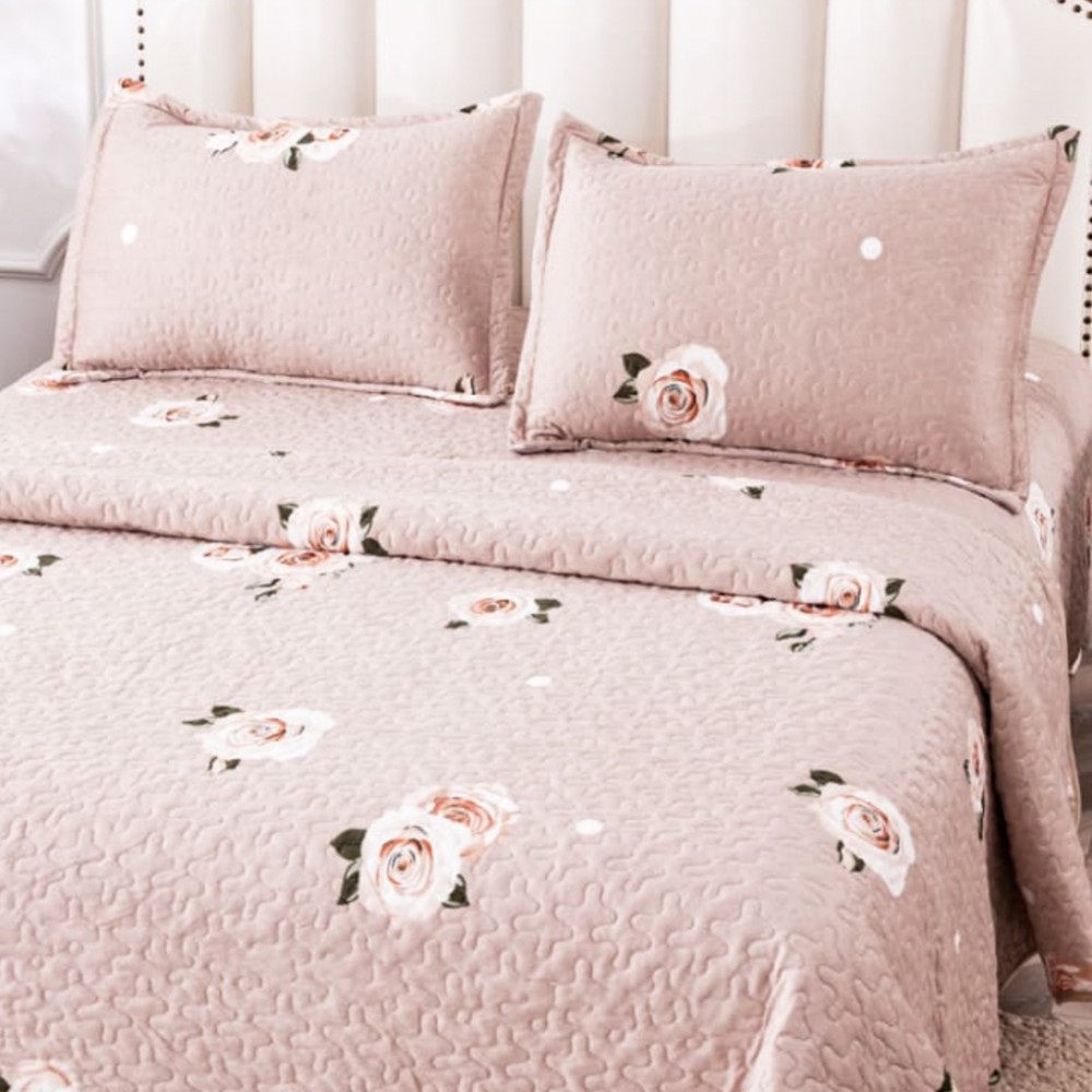 Cuvertură Pat Dublu, Catifea Matlasată, 230x250 cm, 2 fete de perna 60x80cm, Bej, Flori, Casa Minunata, cod produs: INS-CVK10