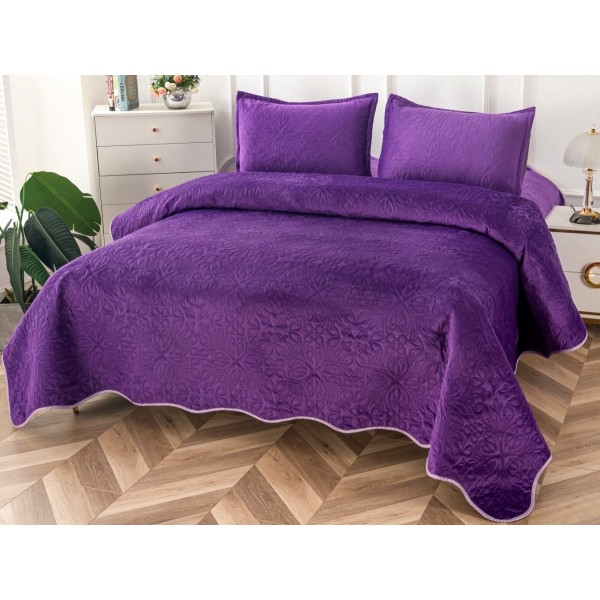 Cuvertura pentru pat dublu confectionata din Catifea, cu model realizat din cusatura, dar si din imprimeul deosebit. Cuvertura este matlasata, avand dosul din bumbac satinat (80% bumbac, 20% poliester). Marginile lucrate cu atentie fiind finisate cu bordura pentru un plus de eleganta.