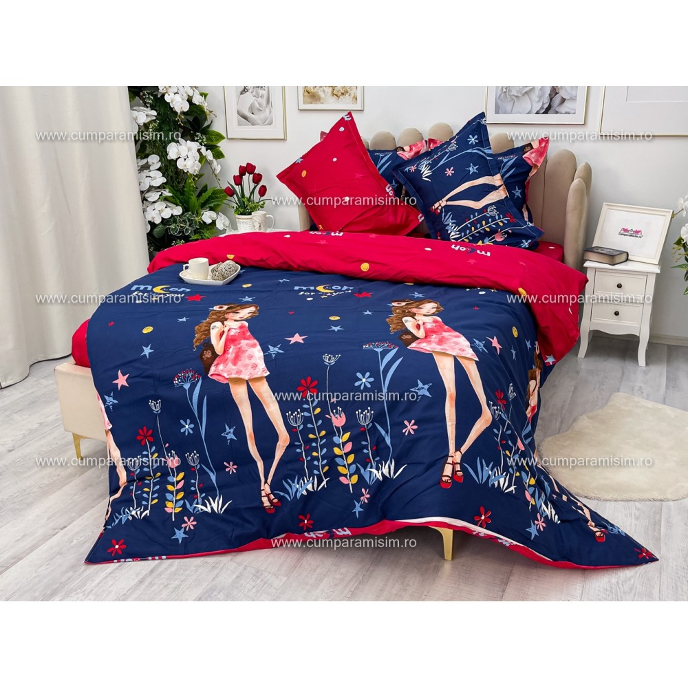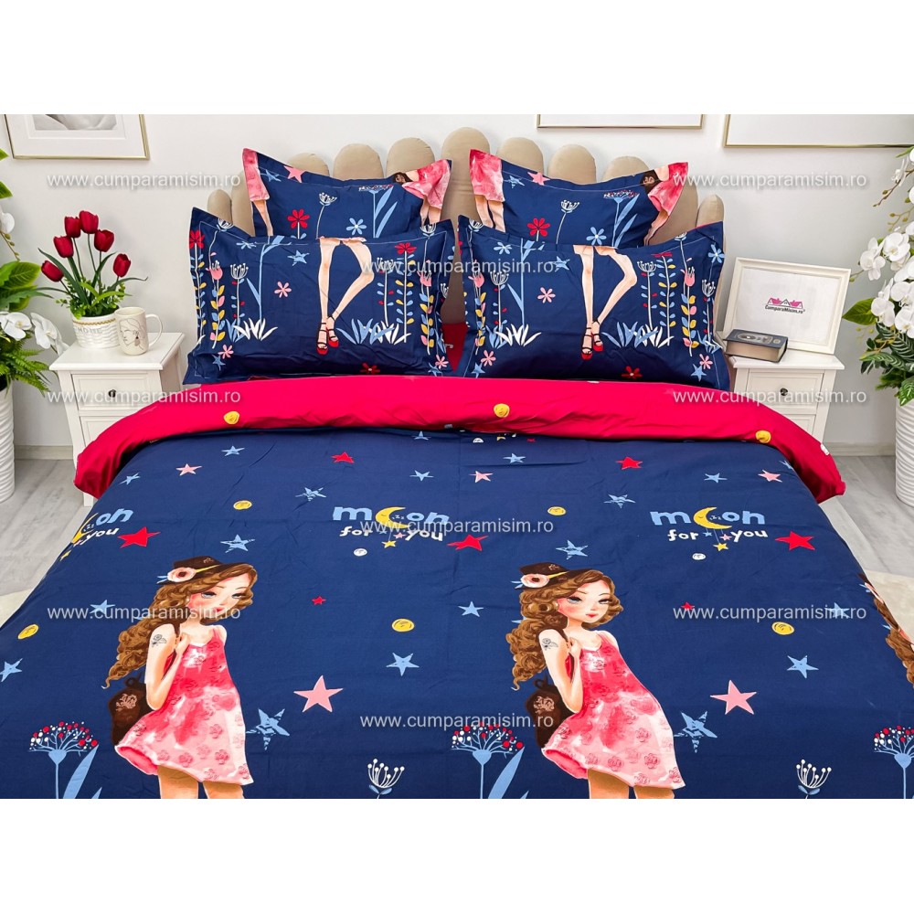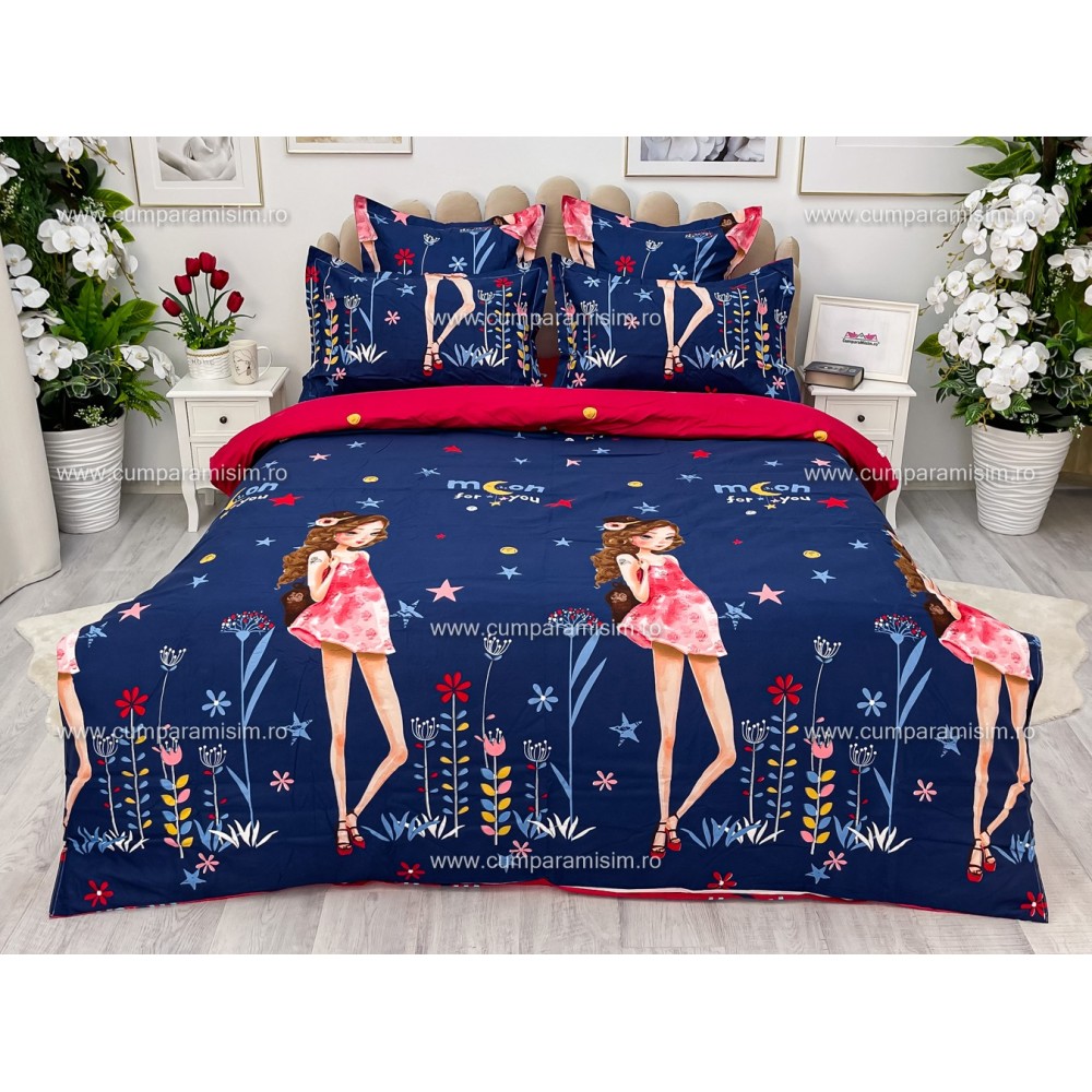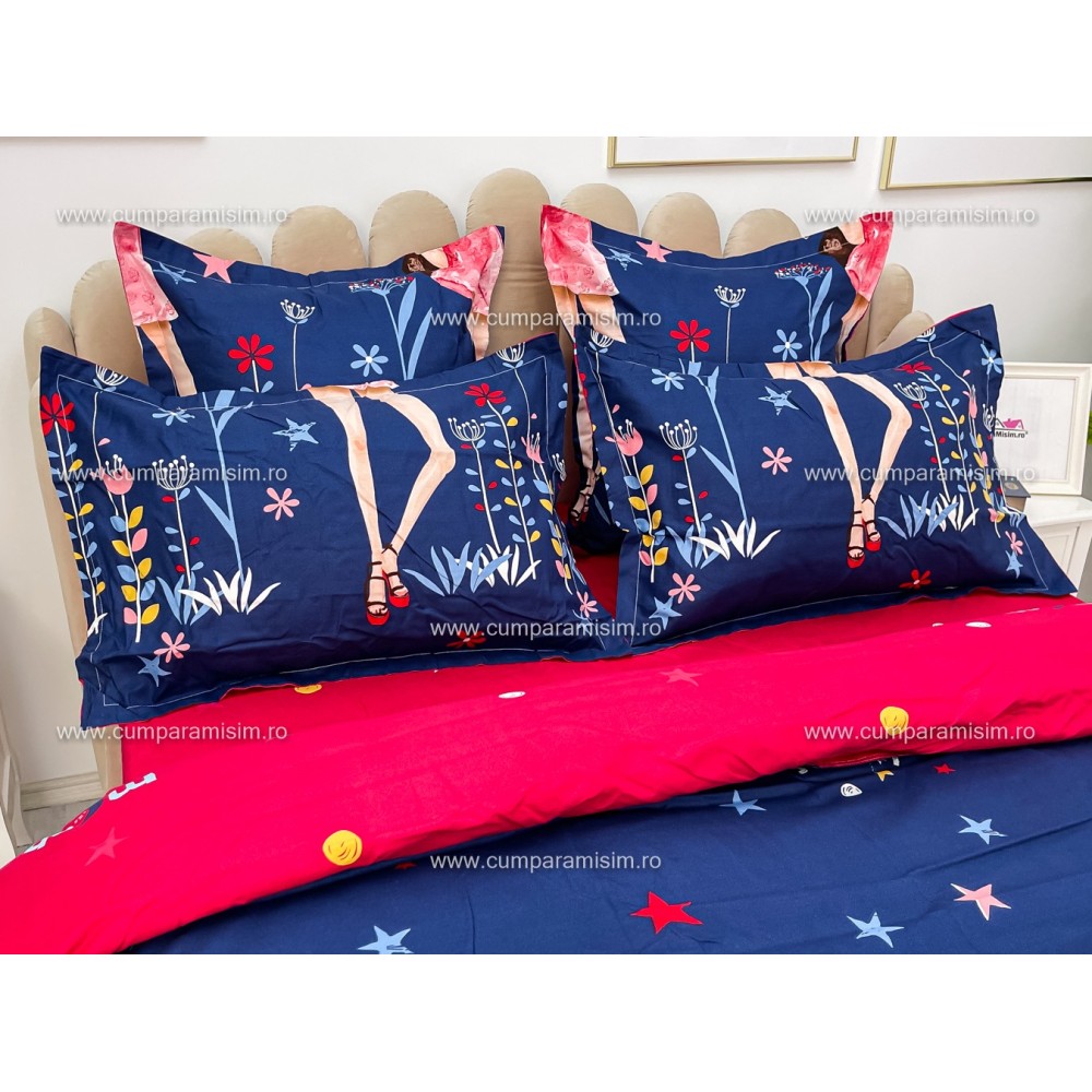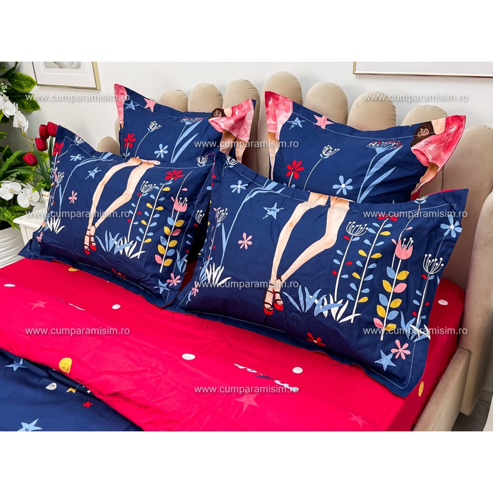 Lenjerie pat dublu, FINET, 6 piese, Jojo Home, Bleumarin-Multicolor, fetite, cod produs: JOF5