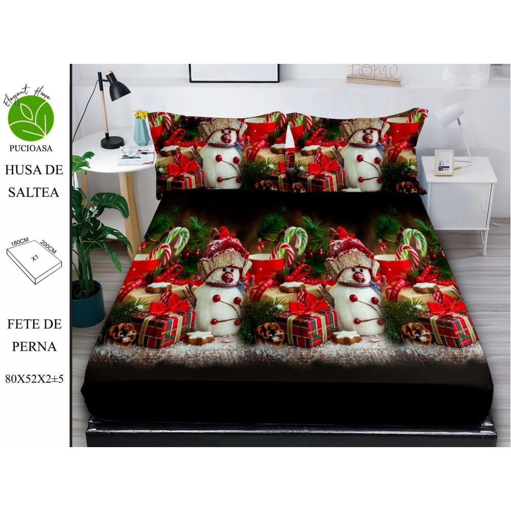 Cearsaf cu elastic tip husa din FINET pentru saltea 180x200+25cm si doua fete de perna 52x80cm, Elegant Home Pucioasa, Mos Craciun, Rosu-Verde, cod produs: HFQ101
