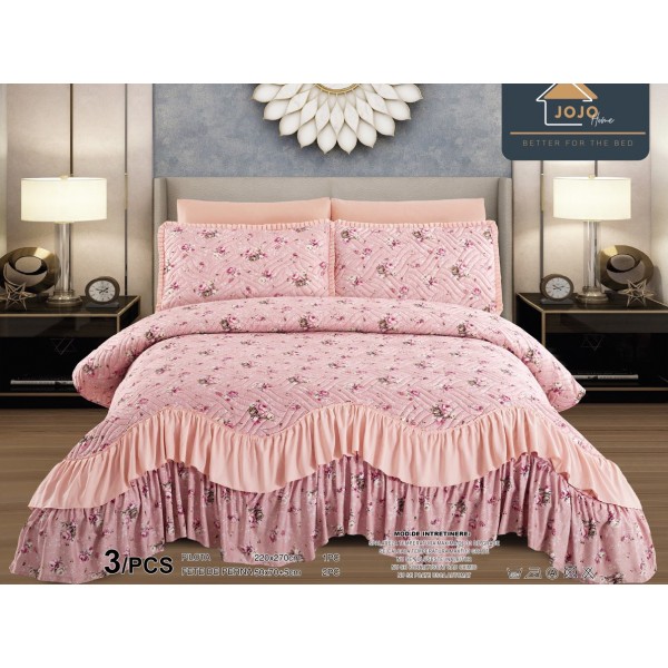 Cuvertura pat dublu, 3 piese, Bumbac Finet, 220x270cm, cu volanase, Jojo Home, Roz, flori, cod produs: JOC56