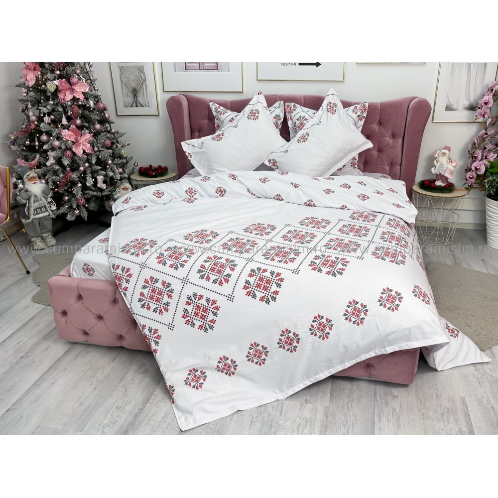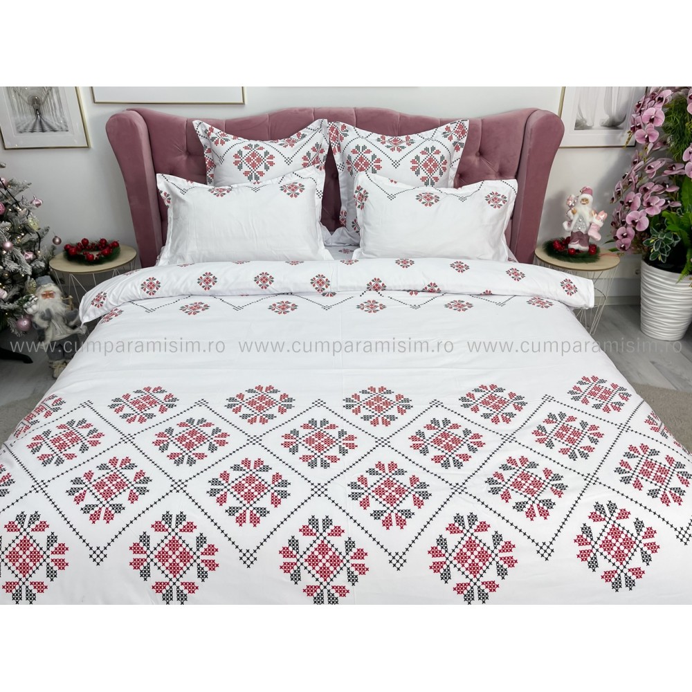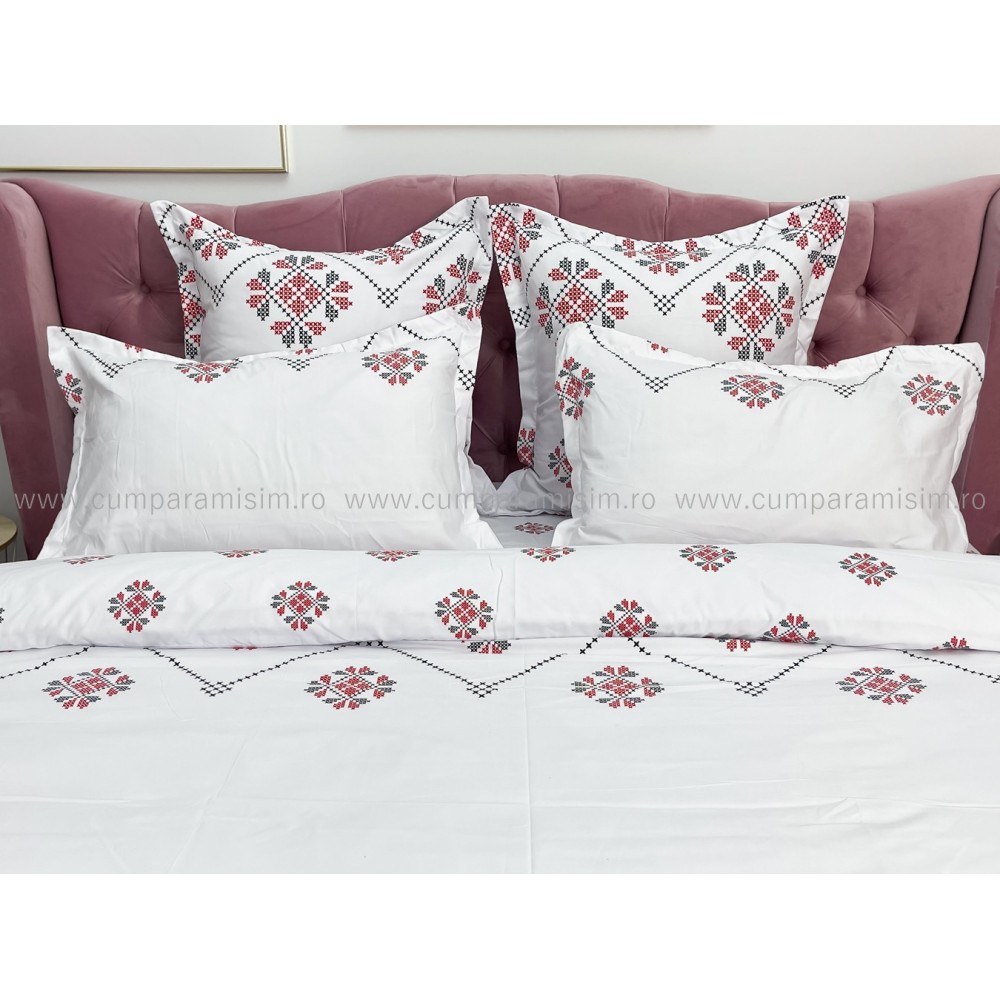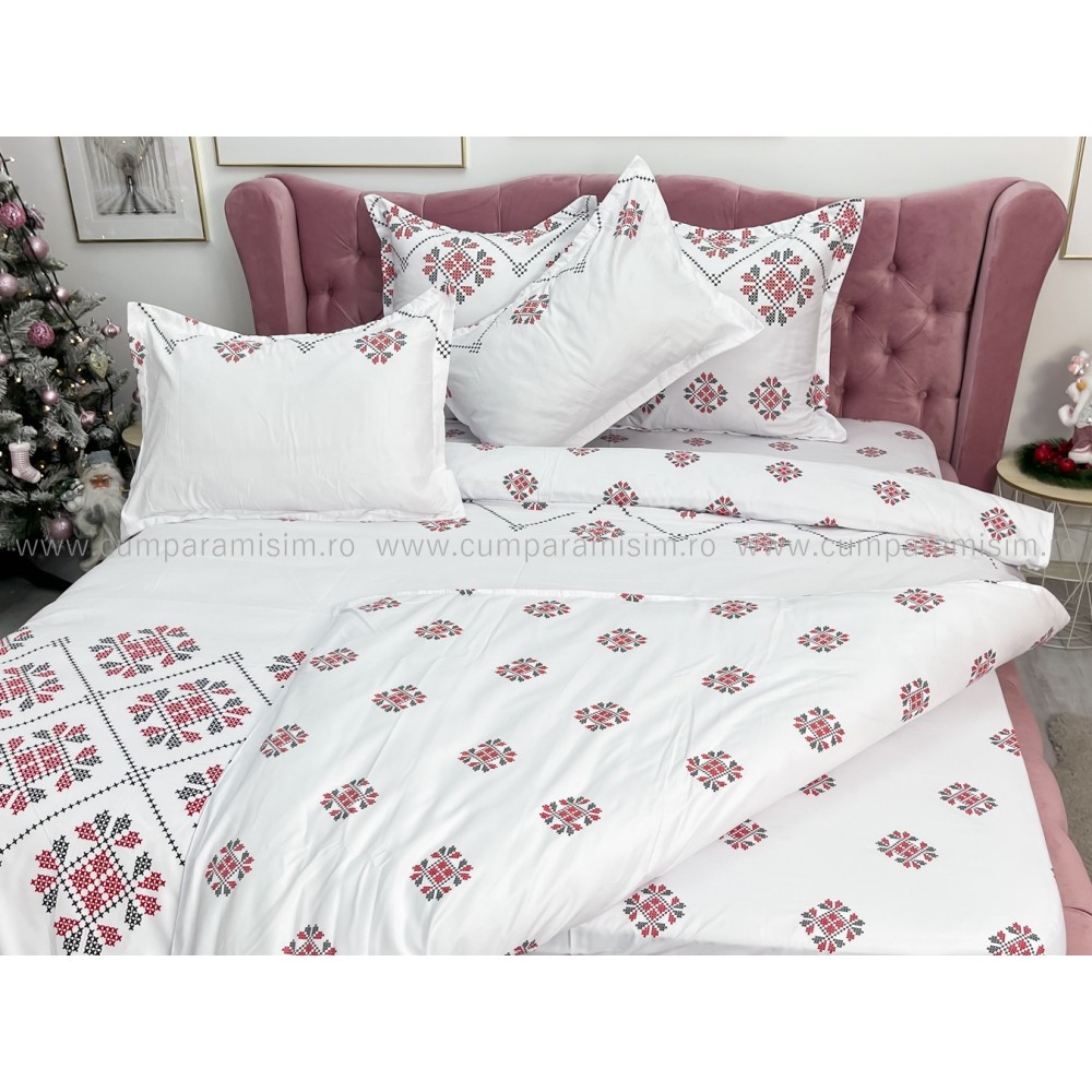 Lenjerie pat dublu, FINET, 6 piese, Jojo Home, Alb-Rosu, model traditional, cod produs: JOF92