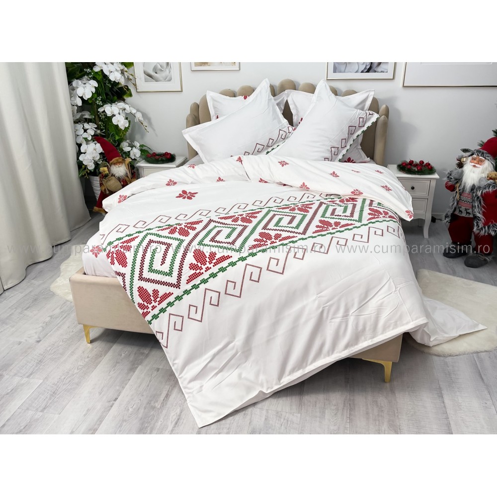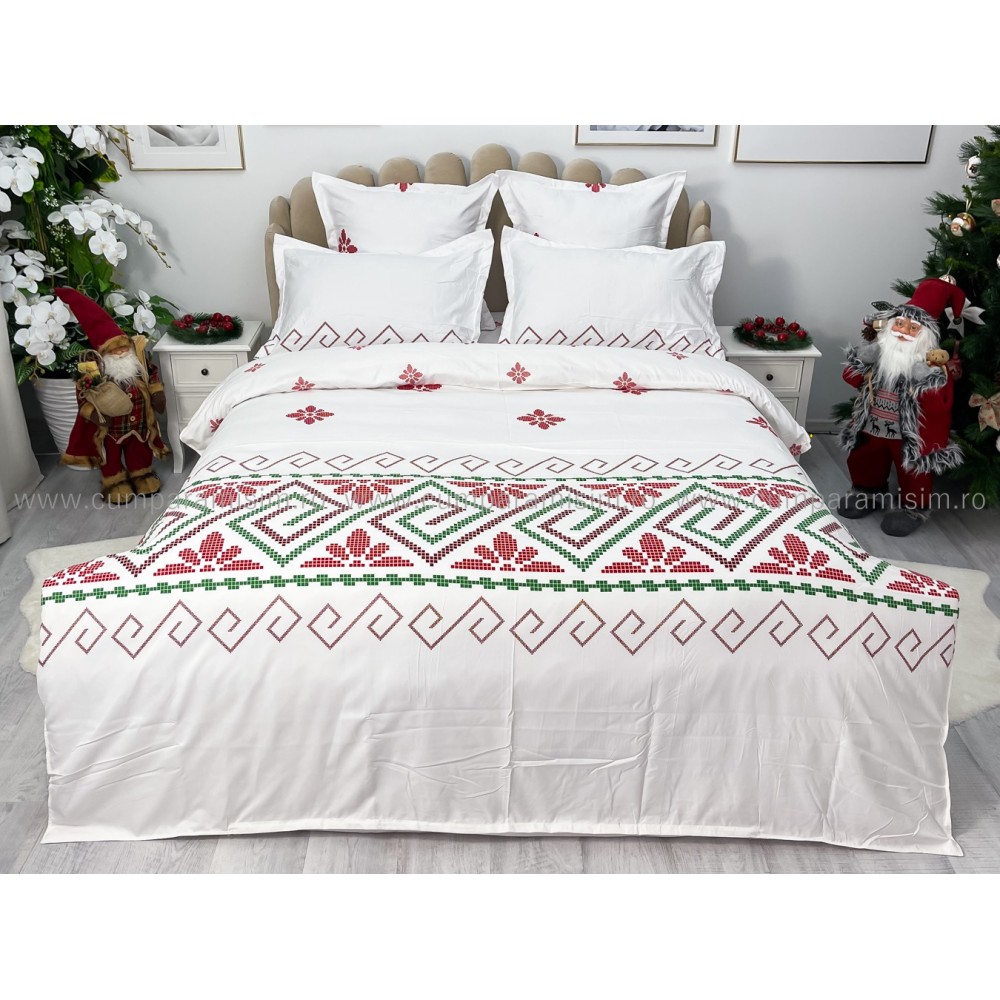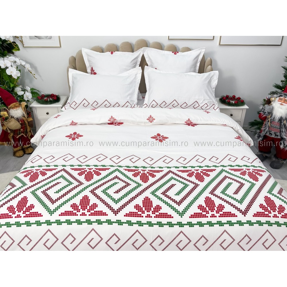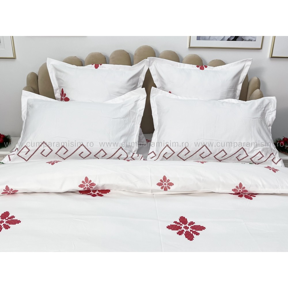 Lenjerie pat dublu, FINET, 6 piese, cu ELASTIC, Jojo Home, Alb-Rosu, model traditional, cod produs: JOF357