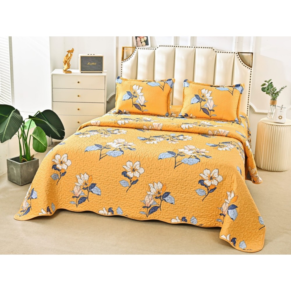 Cuvertura pat dublu din Bumbac Satinat Superior, 3 PIESE, Galben-Albastru, flori, Alti producatori, cod produs: CVP141