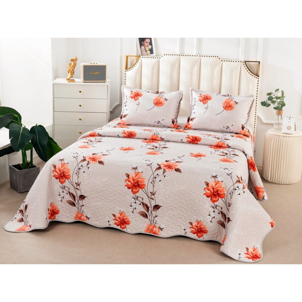 Cuvertura pat dublu din Bumbac Satinat Superior, 3 PIESE, Gri-Rosu, flori, Alti producatori, cod produs: CVP147