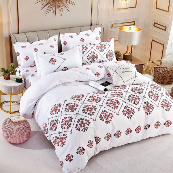 Lenjerie pat 1 PERSOANA, FINET, 4 piese, Jojo Home, Alb-Rosu, model traditional, cod produs: JOS152