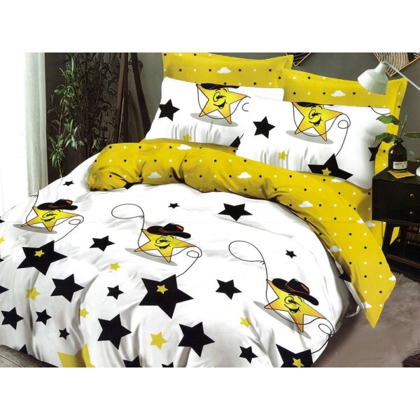 Lenjerie pat dublu, Ralex Pucioasa, Finet, 6 piese, cu elastic, Alb-Galben, stelute, cod produs: RXF506