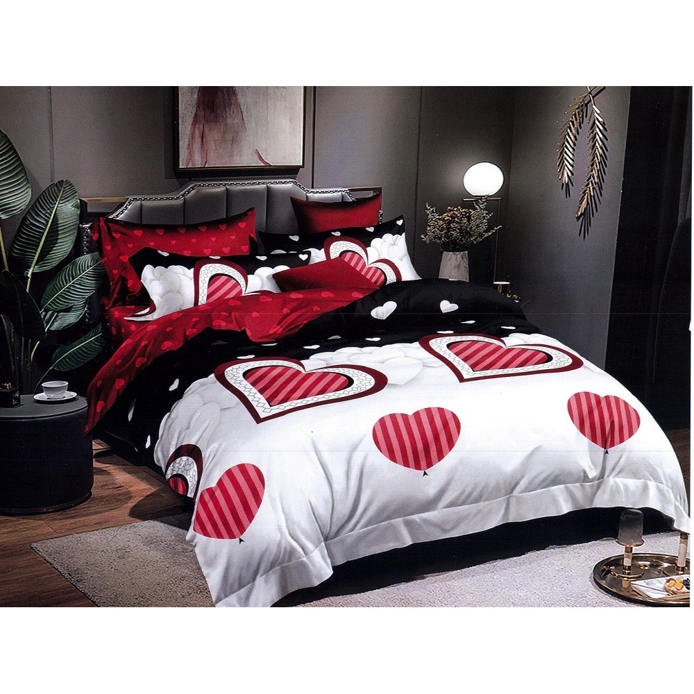 Lenjerie pat dublu, Ralex Pucioasa, Finet, 6 piese, cu elastic, Alb-Rosu, inimioare, cod produs: RXF513
