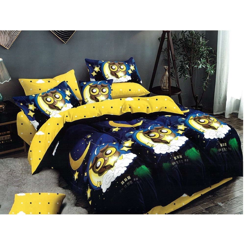Lenjerie pat dublu, Ralex Pucioasa, Finet, 6 piese, cu elastic, Albastru-Galben, bufnite, cod produs: RXF514