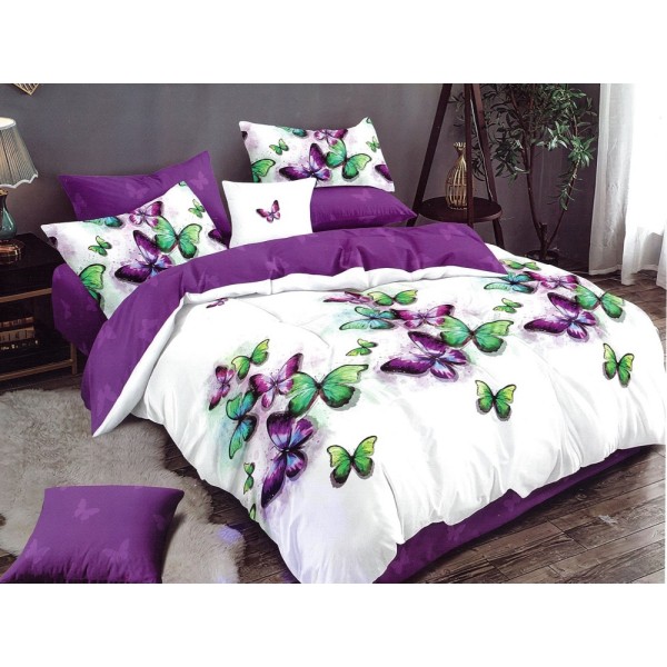 Lenjerie pat dublu, Ralex Pucioasa, Finet, 6 piese, cu elastic, Alb-Mov, fluturi, cod produs: RXF516