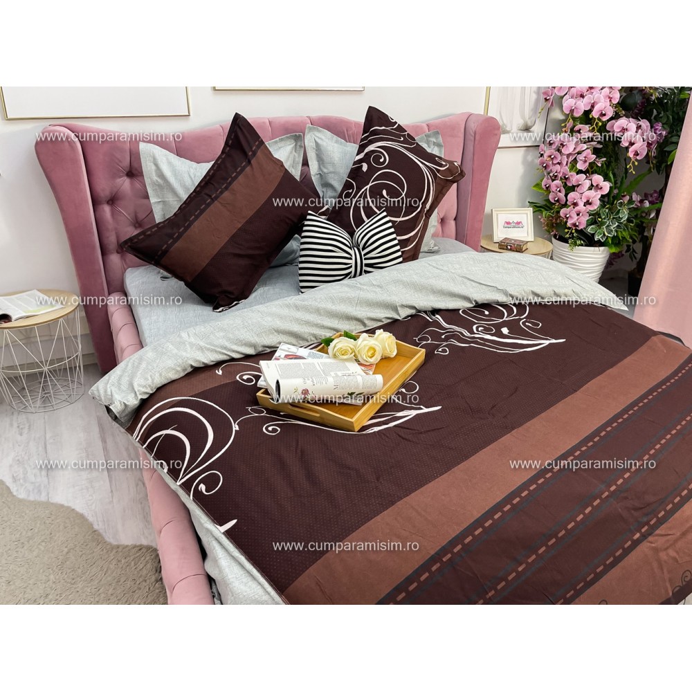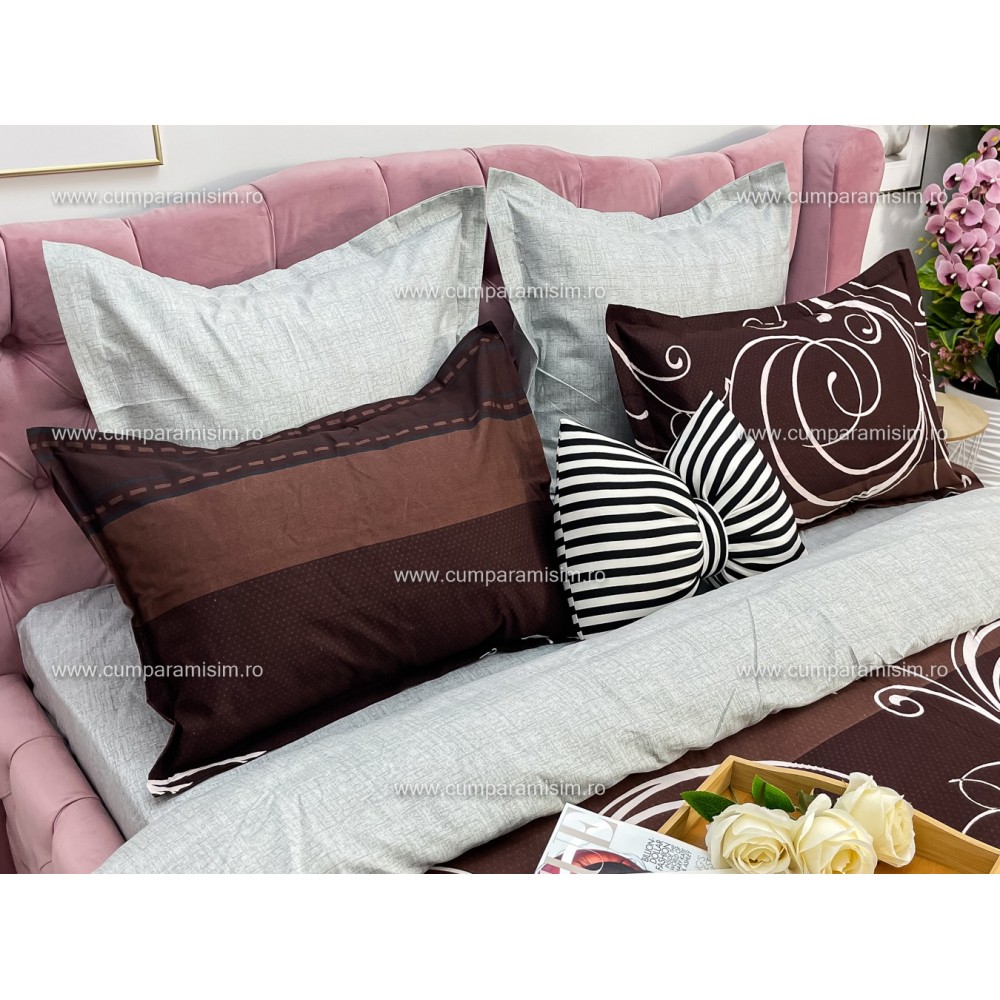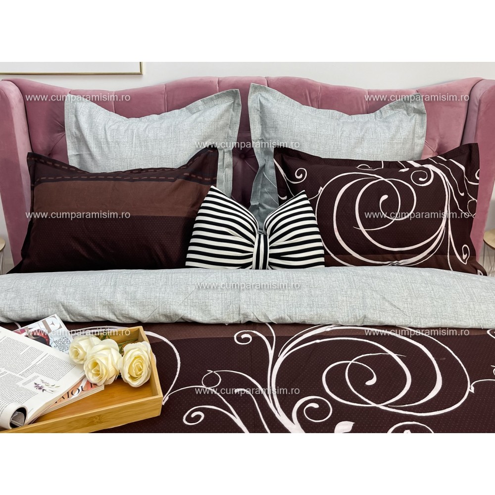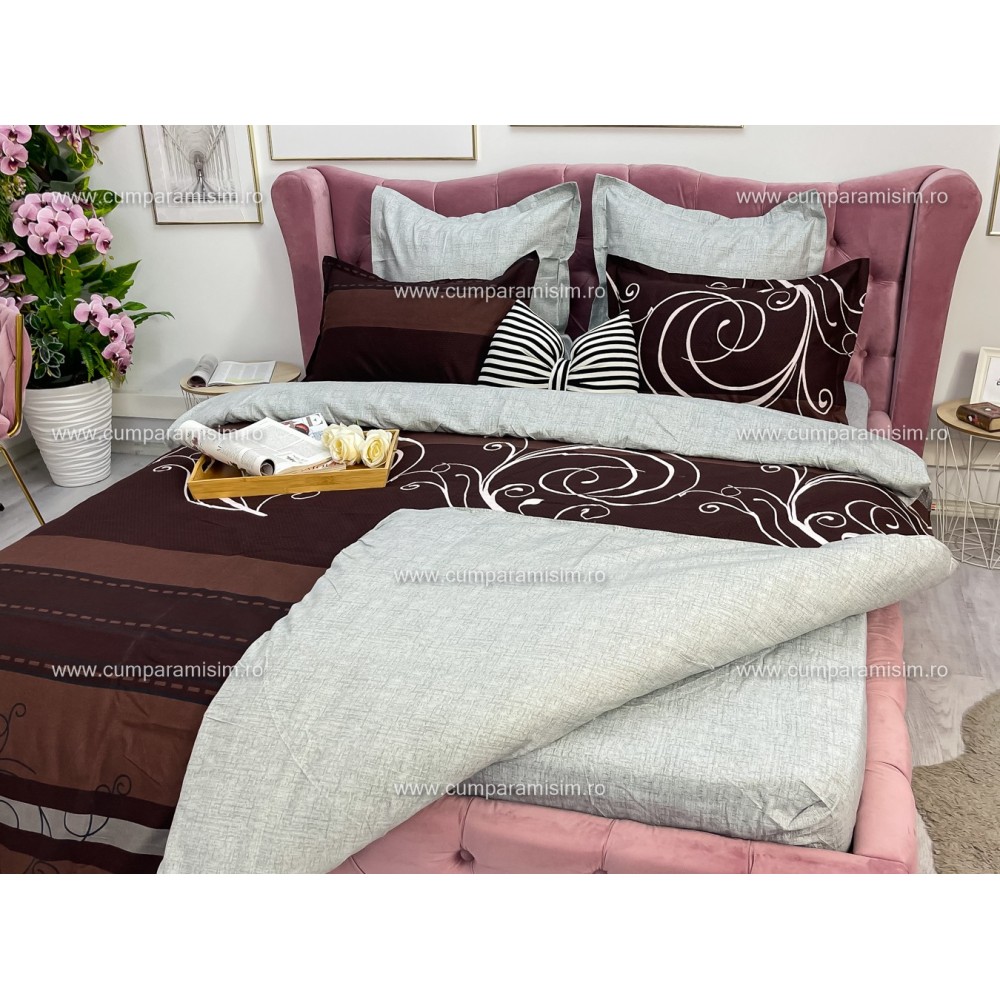 Lenjerie pat dublu, Ralex Pucioasa, Finet, 6 piese, cu elastic, Gri-Maro, model elegant, cod produs: RXF523