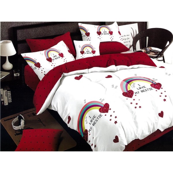 Lenjerie pat dublu, Ralex Pucioasa, Finet, 6 piese, cu elastic, Alb-Rosu, curcubee, inimioare, stelute, cod produs: RXF528