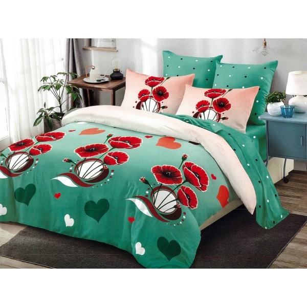 Lenjerie pat dublu, Ralex Pucioasa, Finet, 6 piese, cu elastic, Verde Menta, maci, cod produs: RXF542