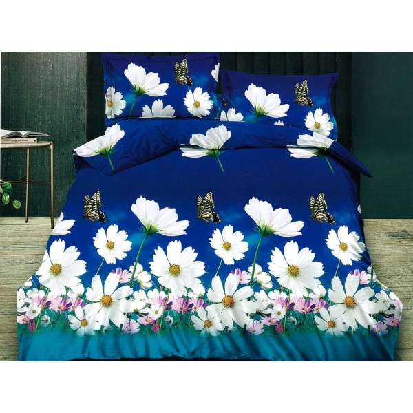 Lenjerie pat dublu, Ralex Pucioasa, Finet, 6 piese, cu elastic, Albastru, flori, fluturi, cod produs: RXF554
