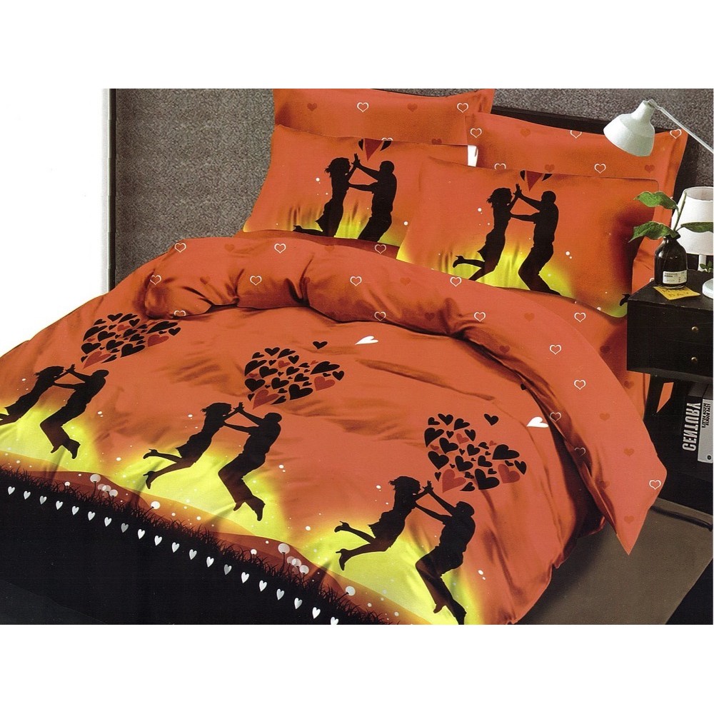 Lenjerie pat dublu, Ralex Pucioasa, Finet, 6 piese, cu elastic, Portocaliu, indragostiti, inimioare, cod produs: RXF558