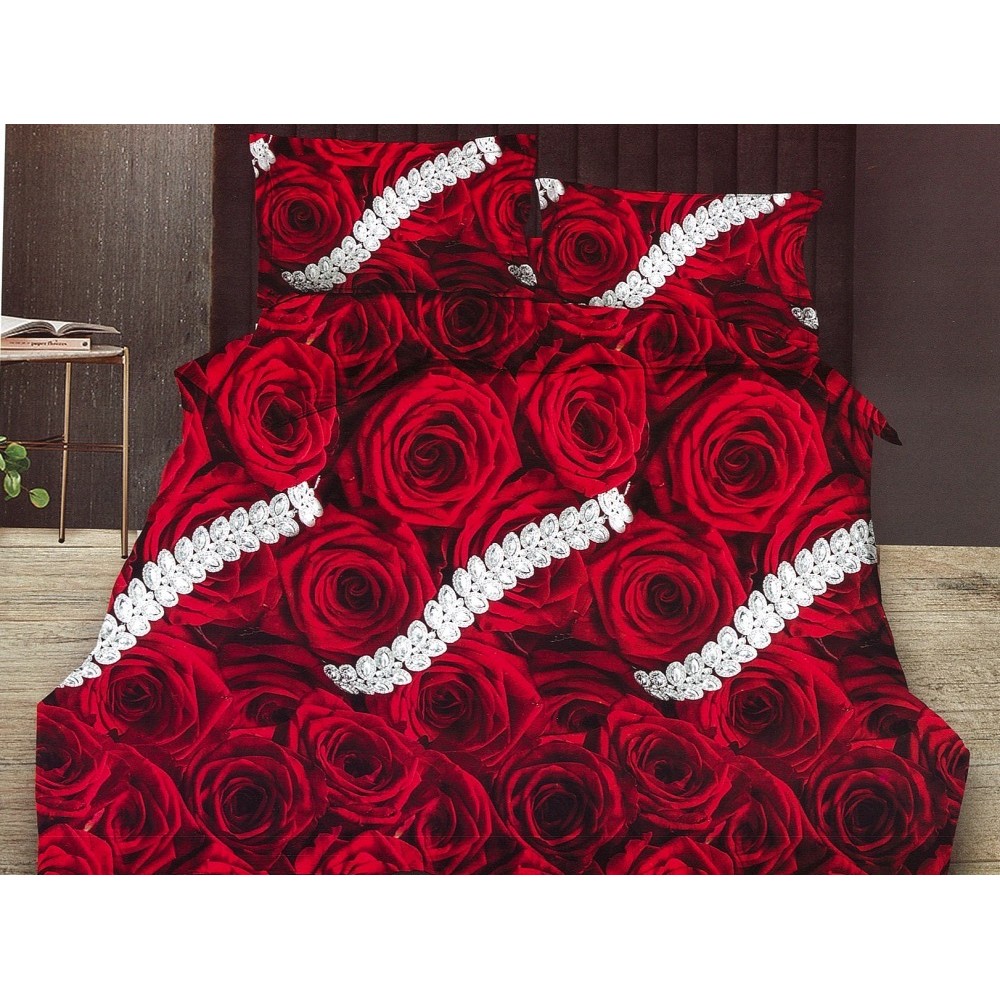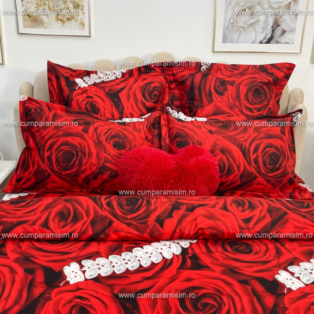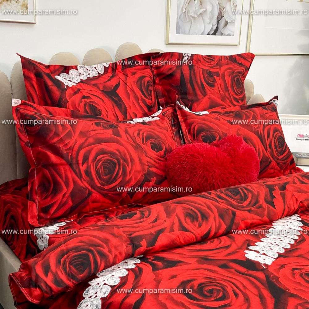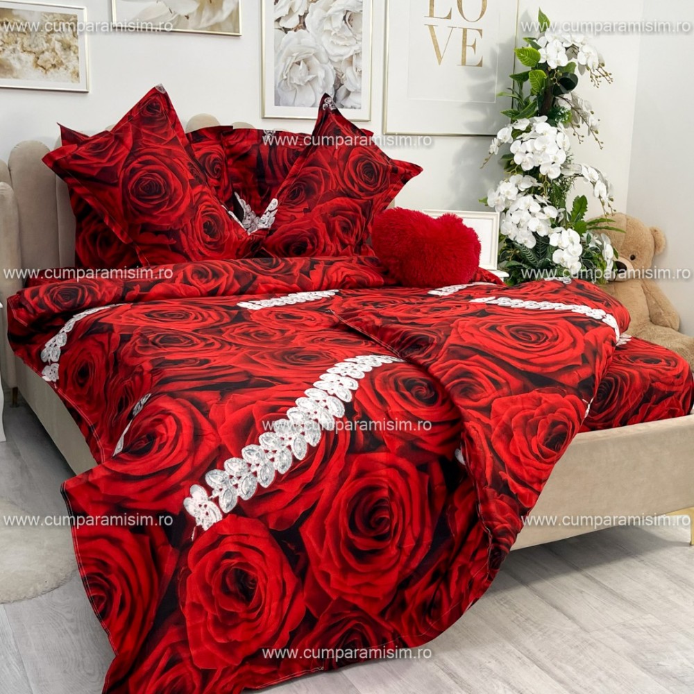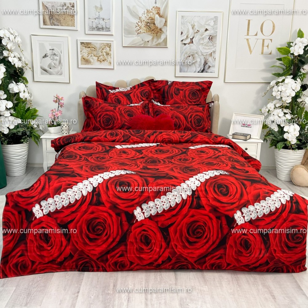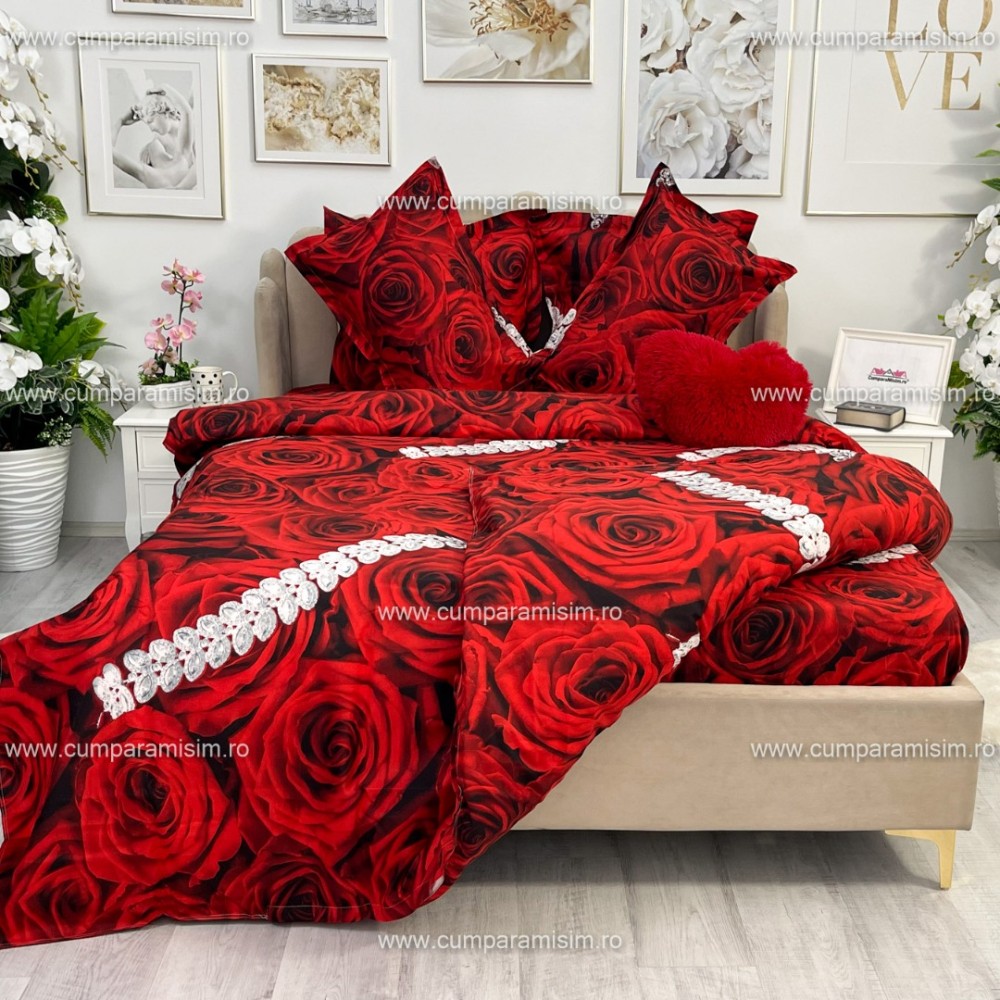 Lenjerie pat dublu, Ralex Pucioasa, Finet, 6 piese, cu elastic, Rosu, flori, trandafiri, cod produs: RXF565