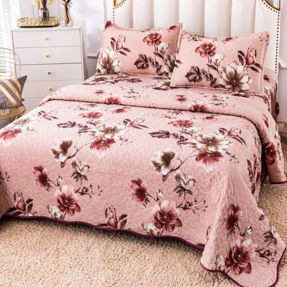 Cuvertura pat dublu, matlasata, din Catifea, 3 piese, 230x250cm, Bej, flori, Alti producatori, cod produs: CVP612