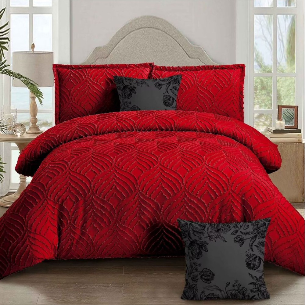 Lenjerie pat dublu, Finet Satinat Deluxe cu Smocuri Brodate, IDENTICA CU POZA, cu elastic, 4 anotimpuri, 6 piese, rosu, Primavara Casa, cod produs: PRC160