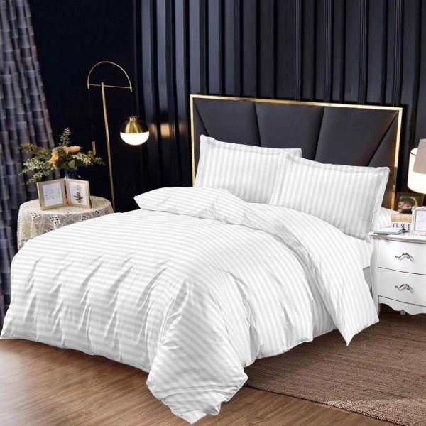 Lenjerie de pat single din damasc finetat, linear (tesatura din fabrica, ci nu imprimata, cu dunga de 1 cm grosime), confectionata din bumbac 70% + 30% poliester, cu 4 piese, folosita cel mai mult in regimul hotelier, datorita simplitatii si calitatii extraordinare. Materialul are un aspect usor lucios pentru o nota de eleganta si rafinament, datorita tesaturii speciale. Damascul este recunoscut pentru rezistenta sa in timp la nenumarate spalari, nemodificandu-si aspectul.