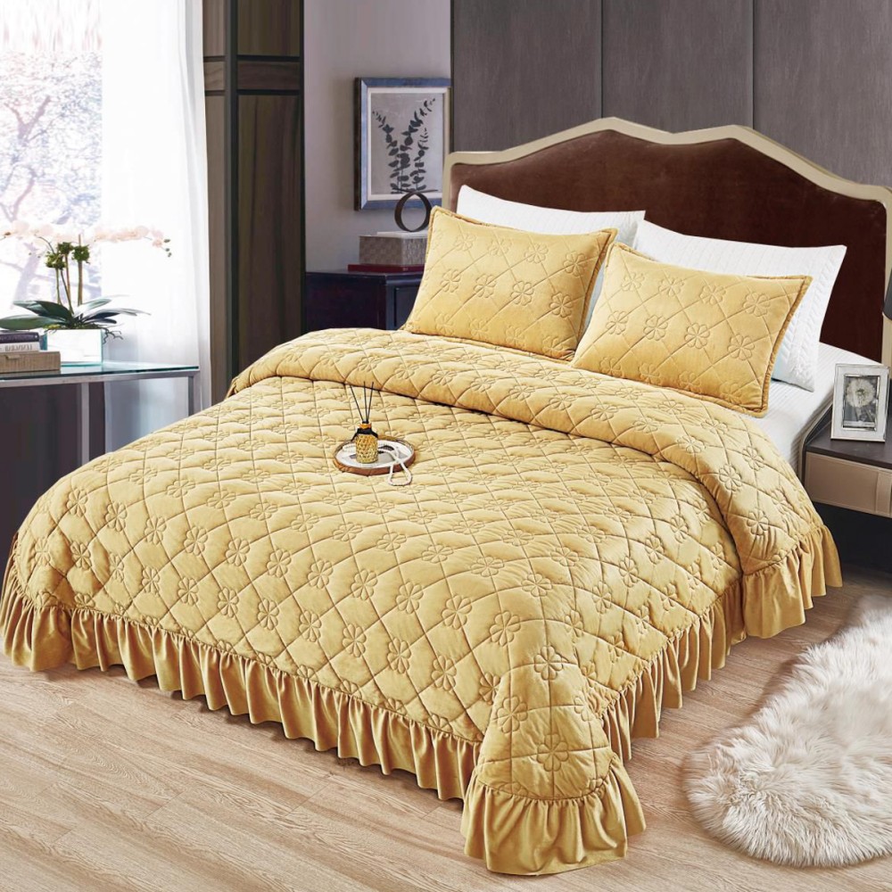Cuvertura pat dublu, 3 piese, Catifea Matlasata cu volanas, 220x240cm + 2 fete de perne 50x70cm, bej, CumparaMisim, cod produs: YAC501
