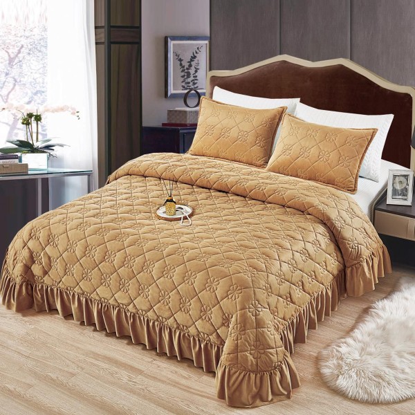 Cuvertura pat dublu, 3 piese, Catifea Matlasata cu volanas, 220x240cm + 2 fete de perne 50x70cm, bej inchis, CumparaMisim, cod produs: YAC502