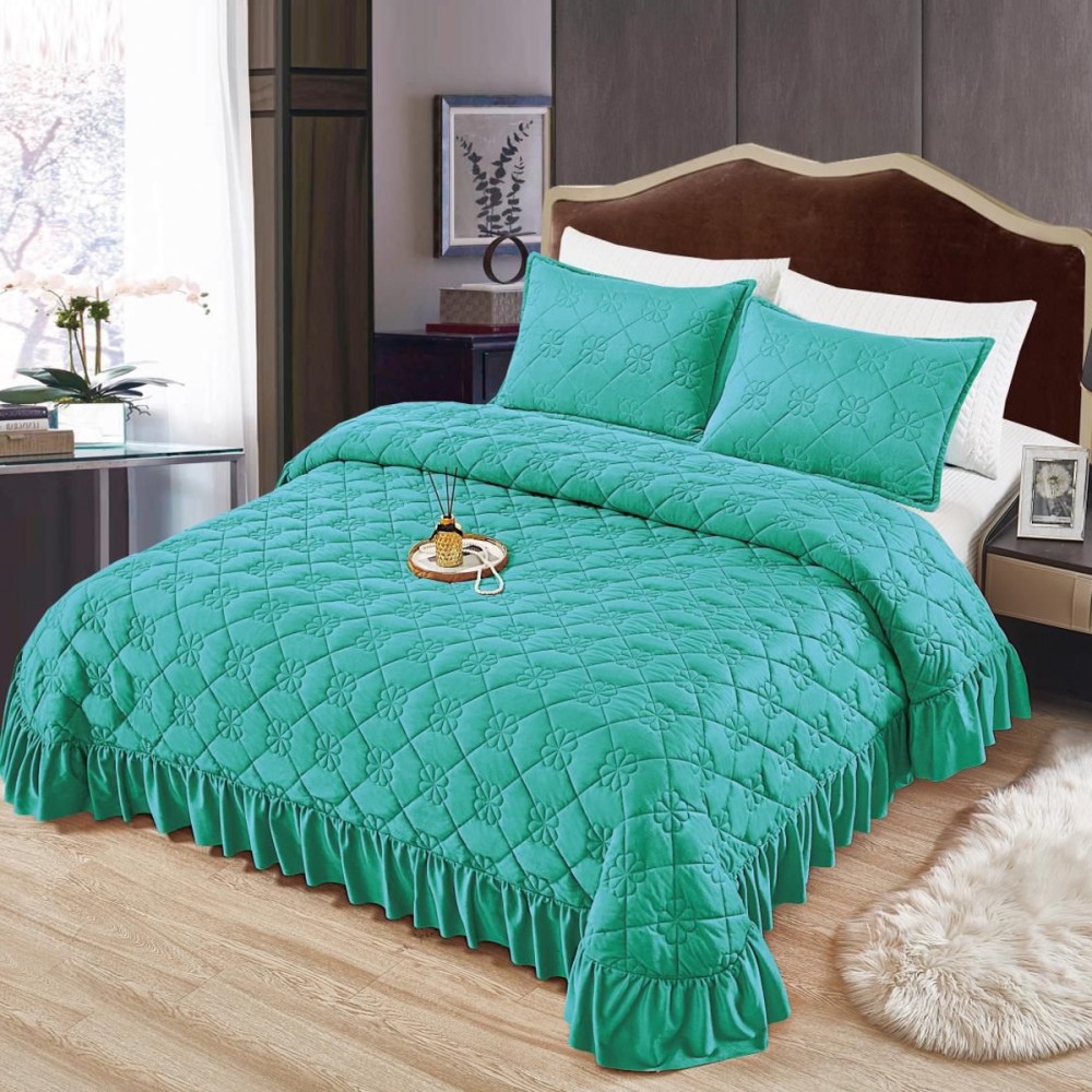 Cuvertura pat dublu, 3 piese, Catifea Matlasata cu volanas, 220x240cm + 2 fete de perne 50x70cm, turquoise, CumparaMisim, cod produs: YAC503