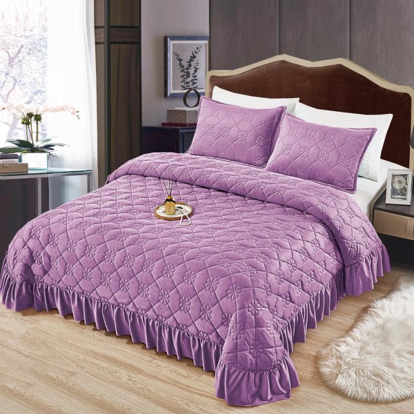 Cuvertura pat dublu, 3 piese, Catifea Matlasata cu volanas, 220x240cm + 2 fete de perne 50x70cm, lila, CumparaMisim, cod produs: YAC506