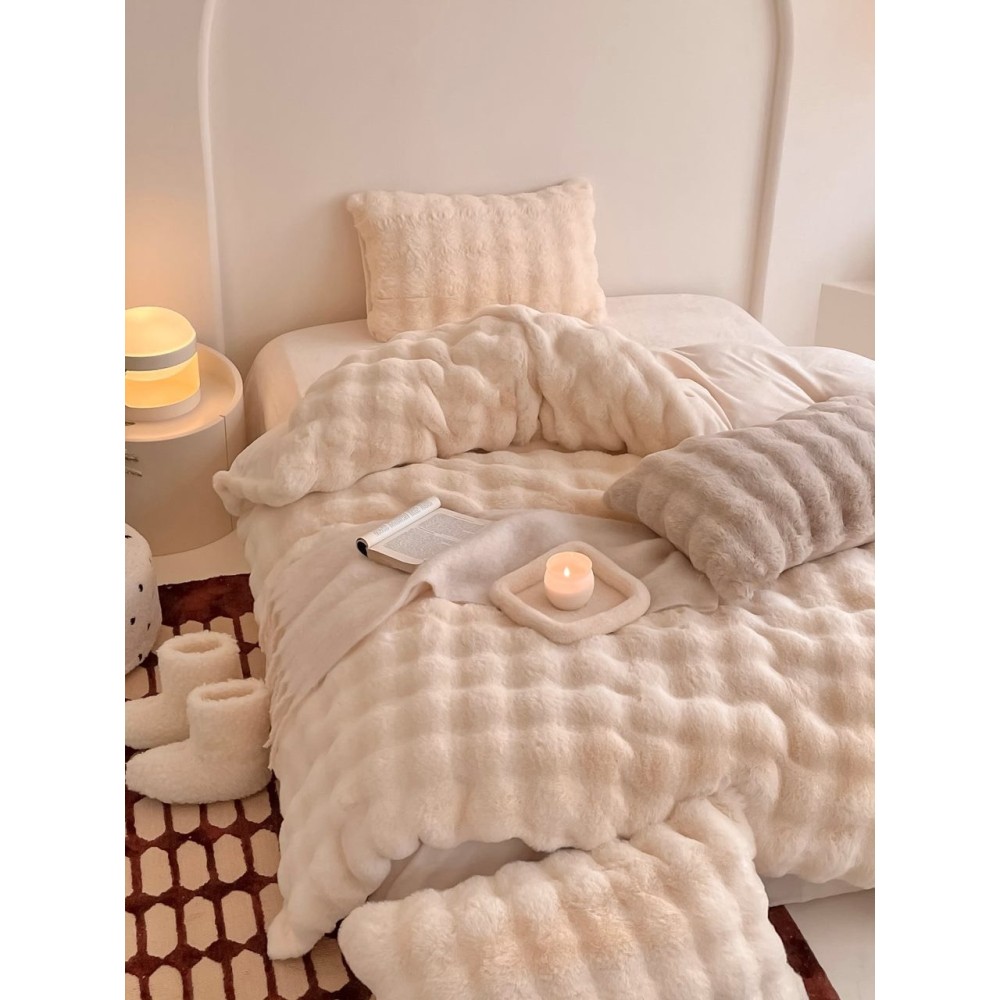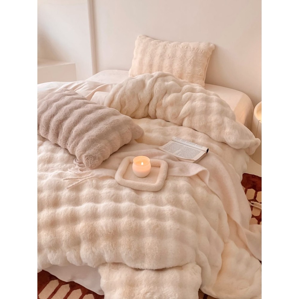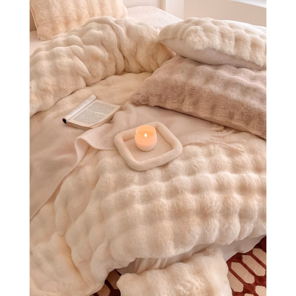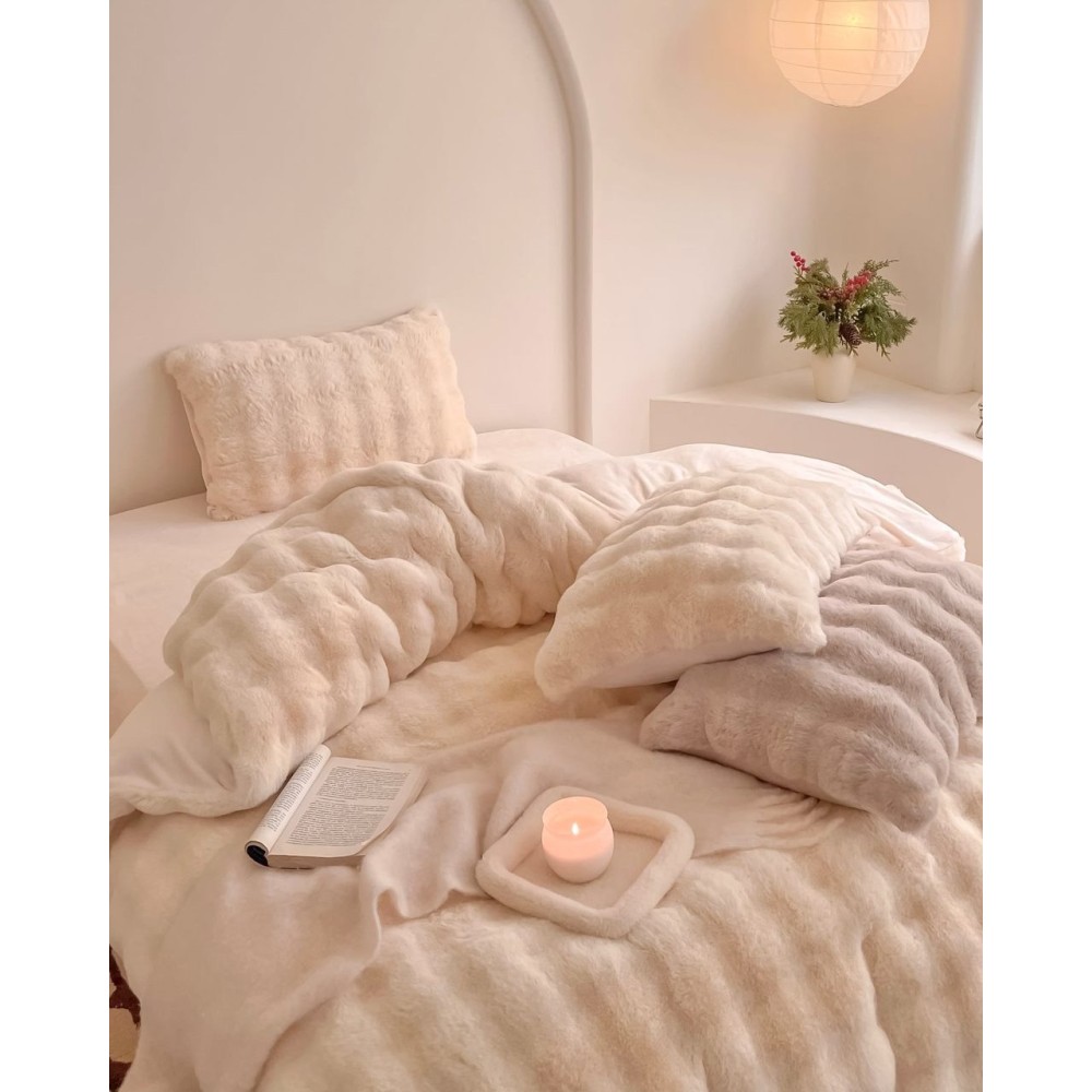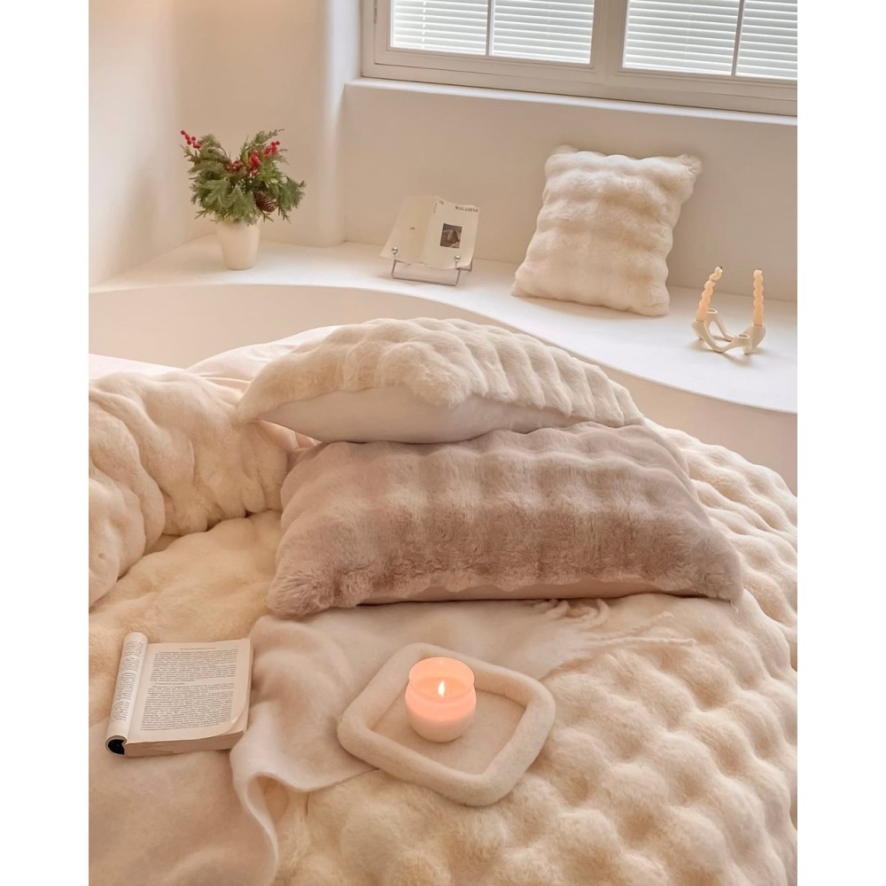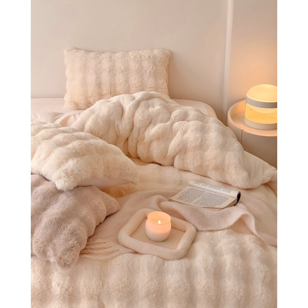Lenjerie de Pat Dublu, ExtraPufoasa din Blăniță Artificială de Iepure, 4 piese, Crem – Confort Premium și Eleganță Absolută, Casa Creativ Elegant Pucioasa, cod produs: BCC-BY-06