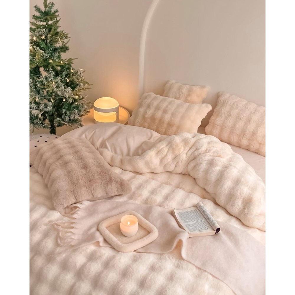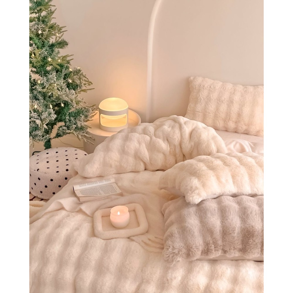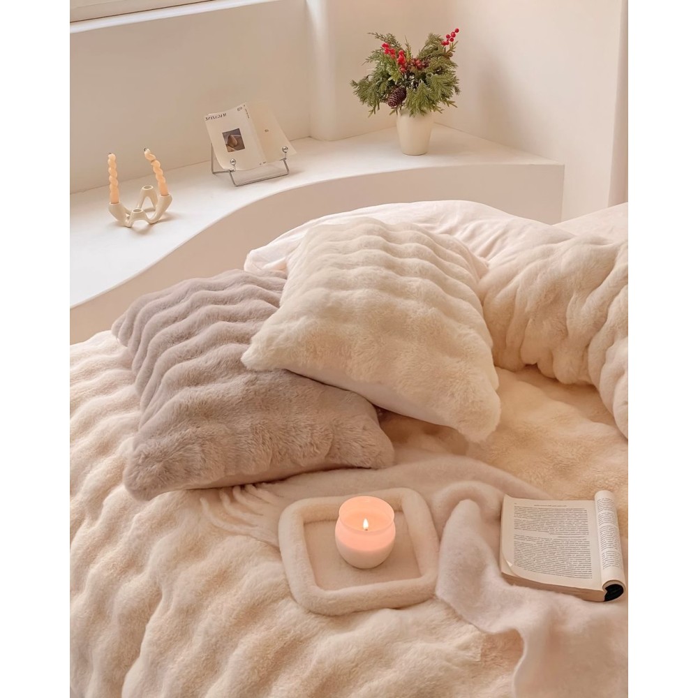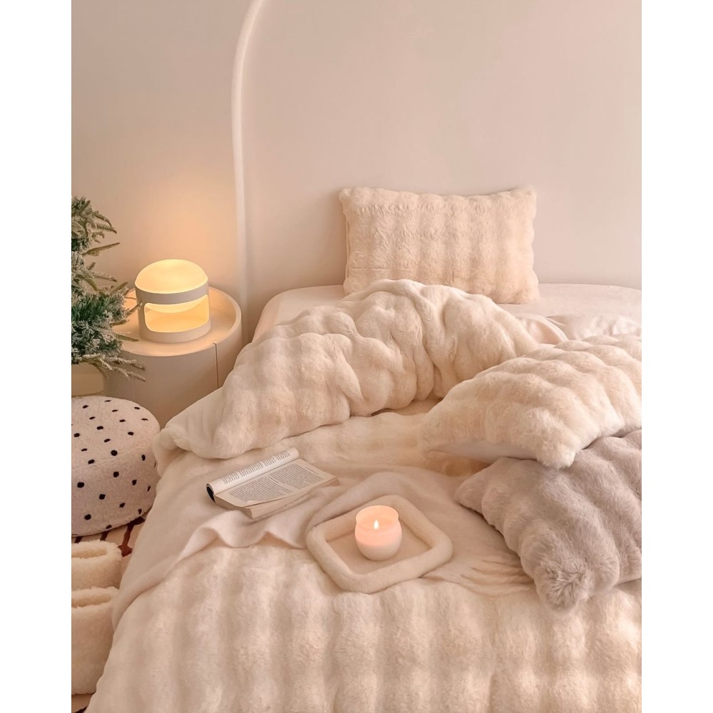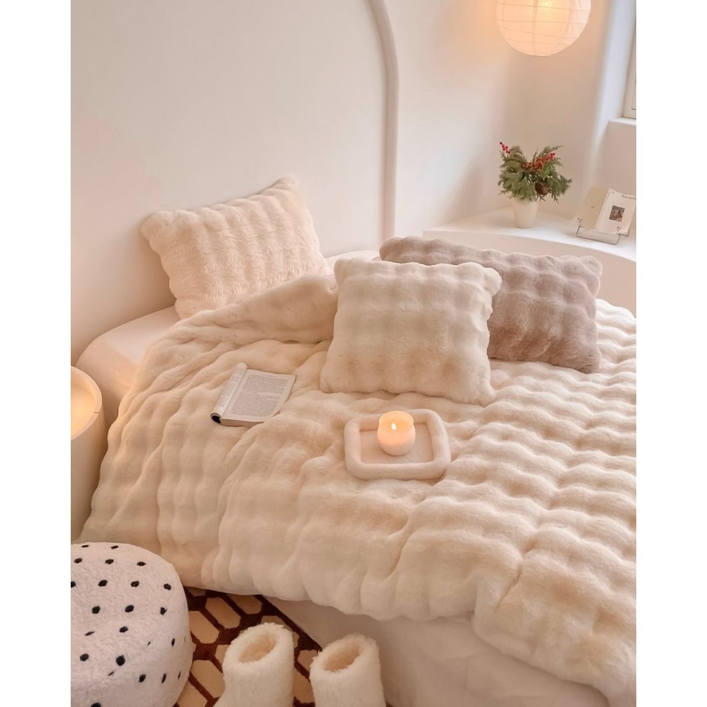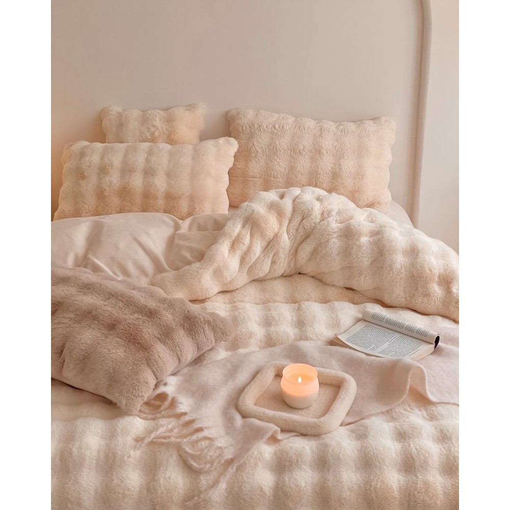 Lenjerie de Pat Dublu, ExtraPufoasa din Blăniță Artificială de Iepure, 4 piese, Crem – Confort Premium și Eleganță Absolută, Casa Creativ Elegant Pucioasa, cod produs: BCC-BY-06