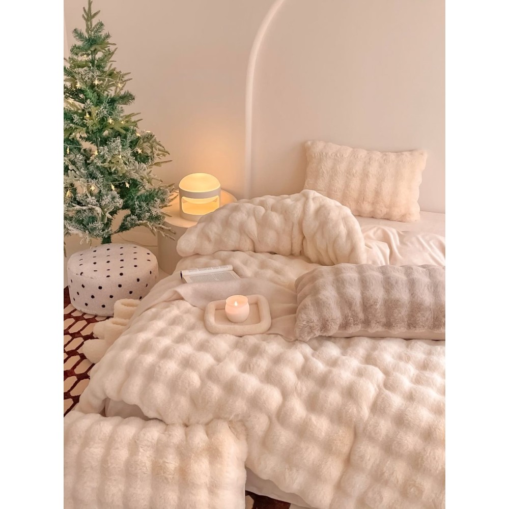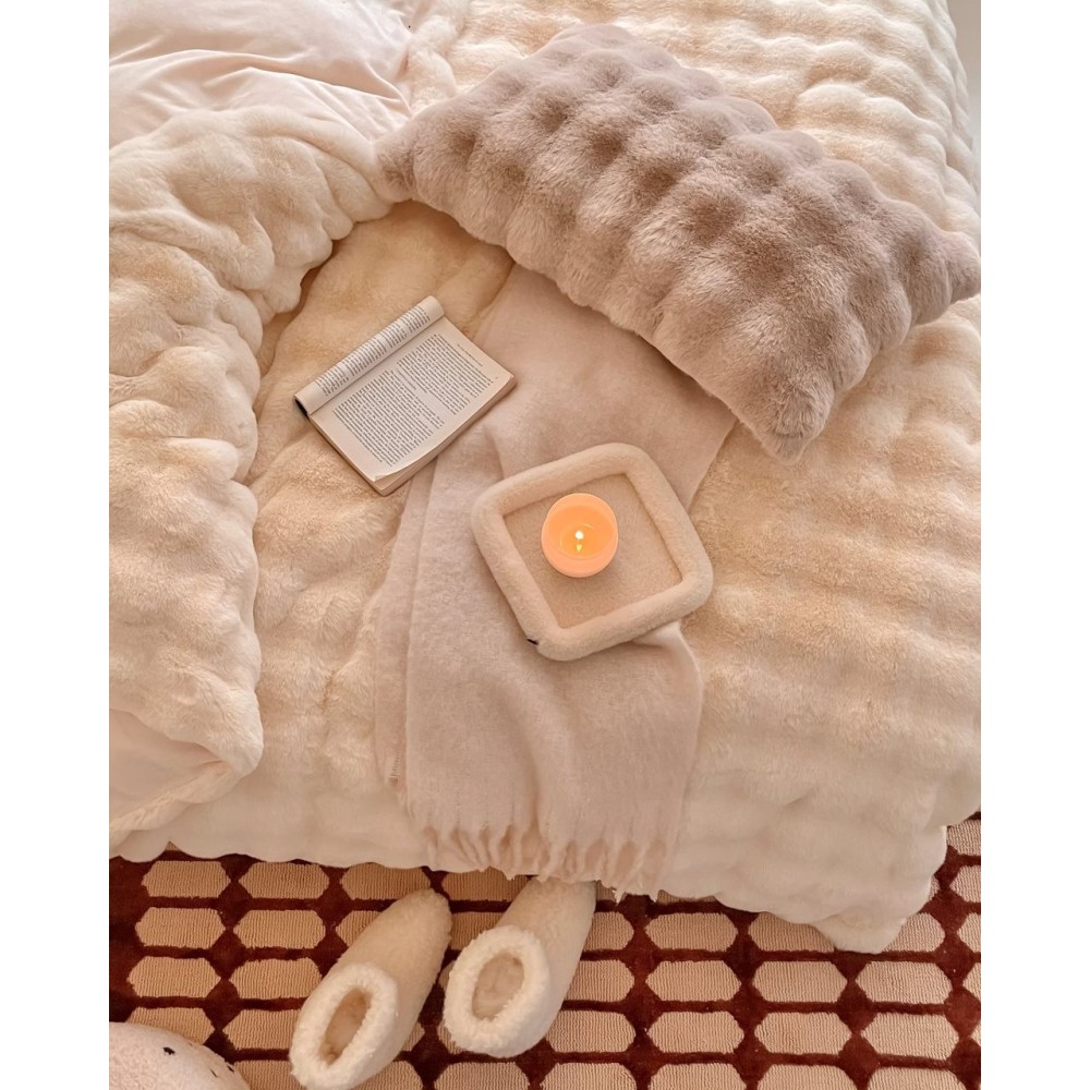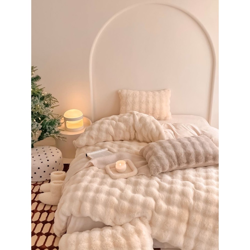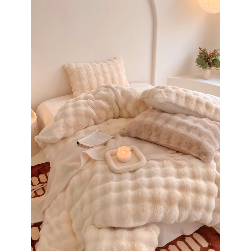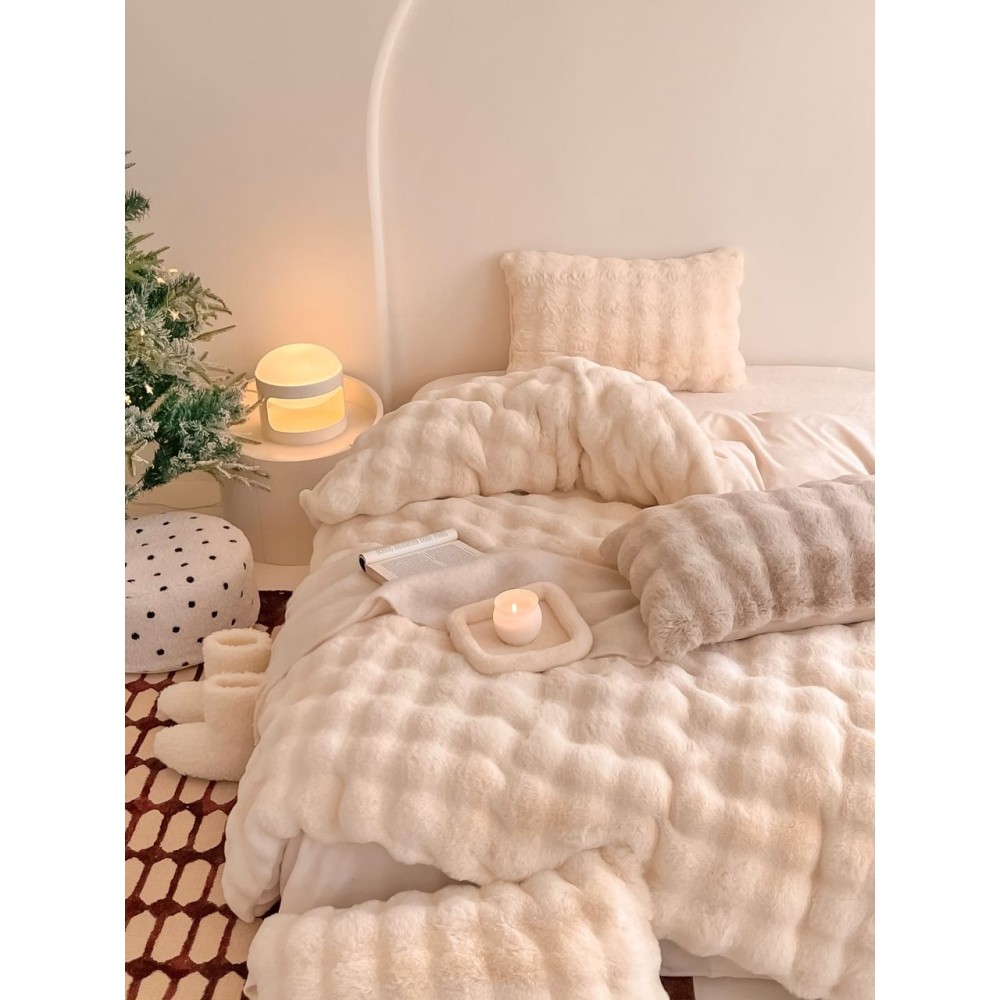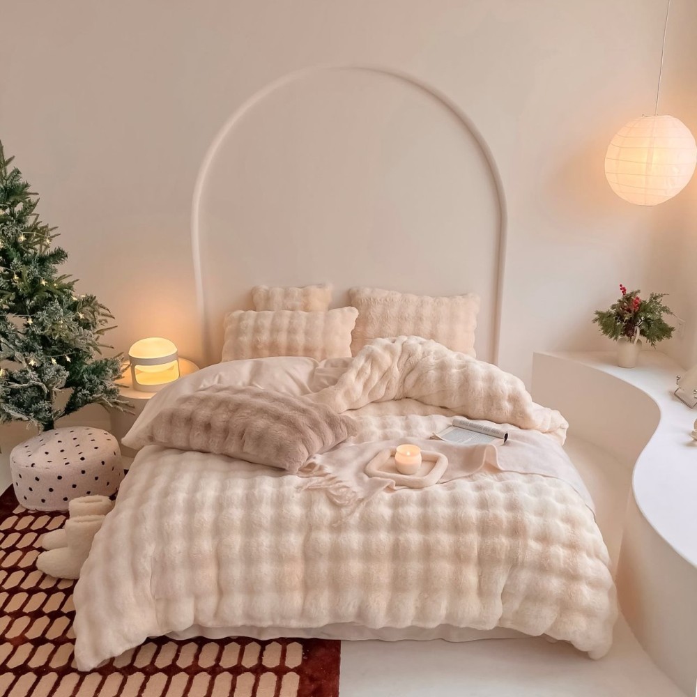Lenjerie de Pat Dublu, ExtraPufoasa din Blăniță Artificială de Iepure, 4 piese, Crem – Confort Premium și Eleganță Absolută, Casa Creativ Elegant Pucioasa, cod produs: BCC-BY-06