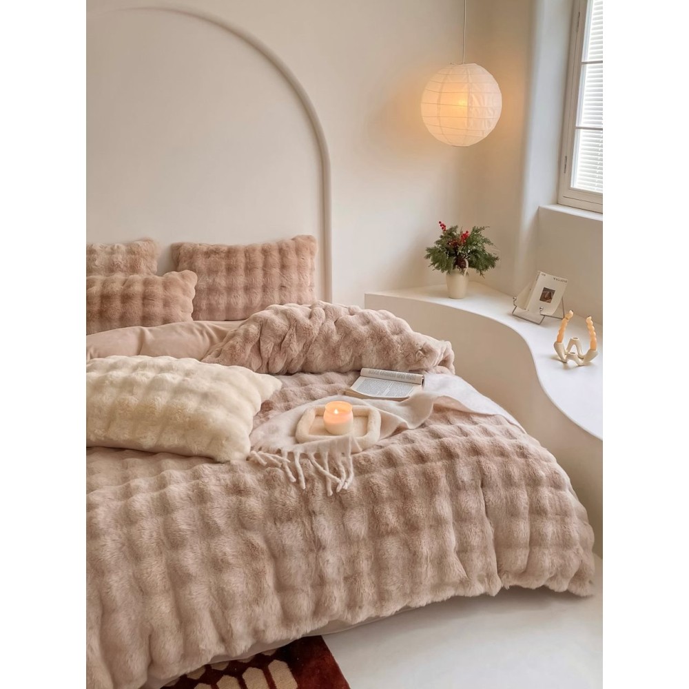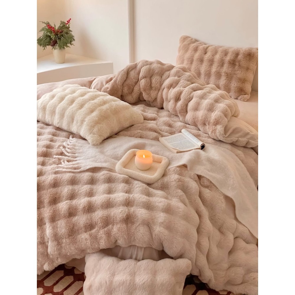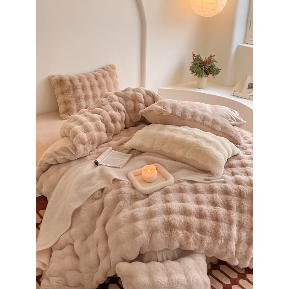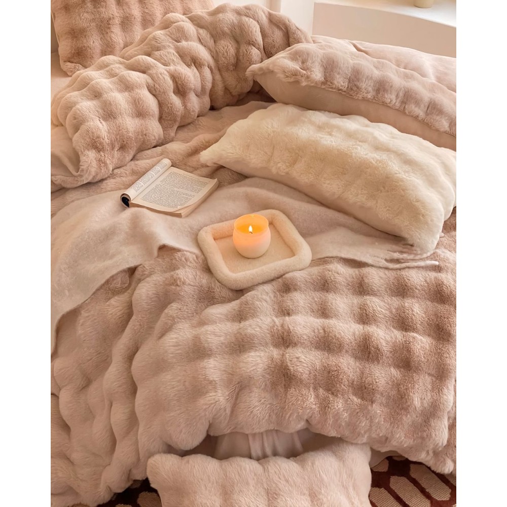 Lenjerie de Pat Dublu, ExtraPufoasa din Blăniță Artificială de Iepure, 4 piese, Bej – Confort Premium și Eleganță Absolută, Casa Creativ Elegant Pucioasa, cod produs: BCC-BY-10