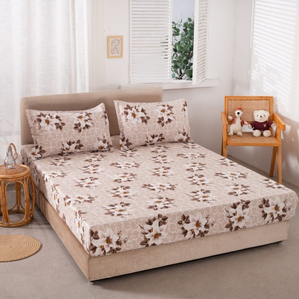 Cearsaf cu elastic, Bumbac Satinat, 160/180x200cm, 2 fete de perne 50x70cm, Bej, flori, Alti producatori, cod produs: HSP73