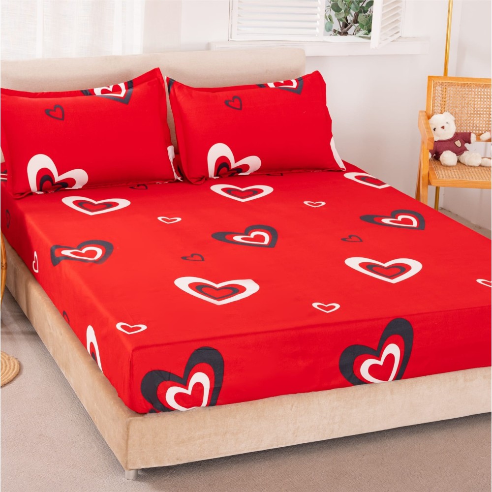 Cearsaf cu elastic, Bumbac Satinat, 160/180x200cm, 2 fete de perne 50x70cm, Rosu, inimioare, Alti producatori, cod produs: HSP75