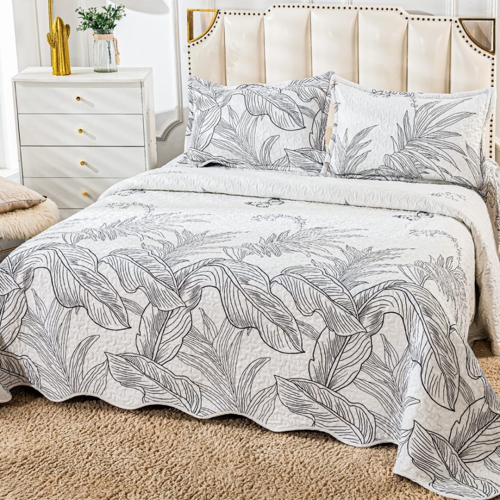 Cuvertura pat dublu din Bumbac Satinat Superior, 3 PIESE, Gri, frunze, Alti producatori, cod produs: CVP4