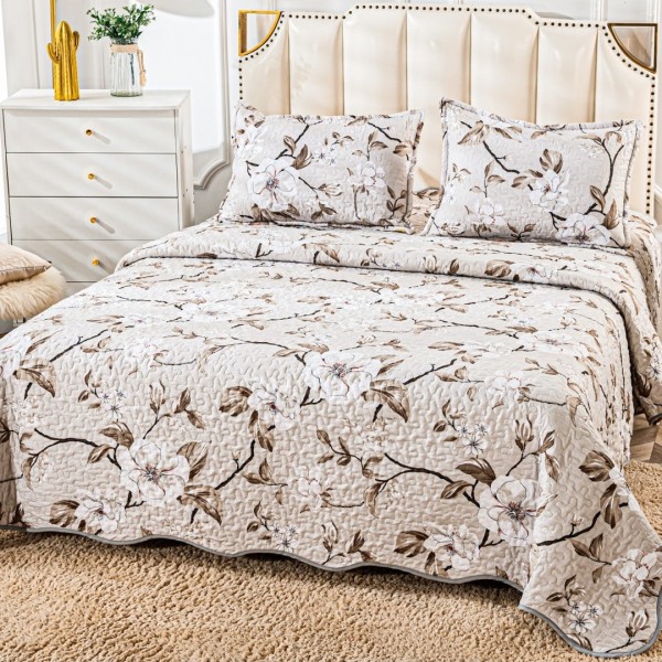 Cuvertura pat dublu din Bumbac Satinat Superior, 3 PIESE, Bej, flori, Alti producatori, cod produs: CVP6